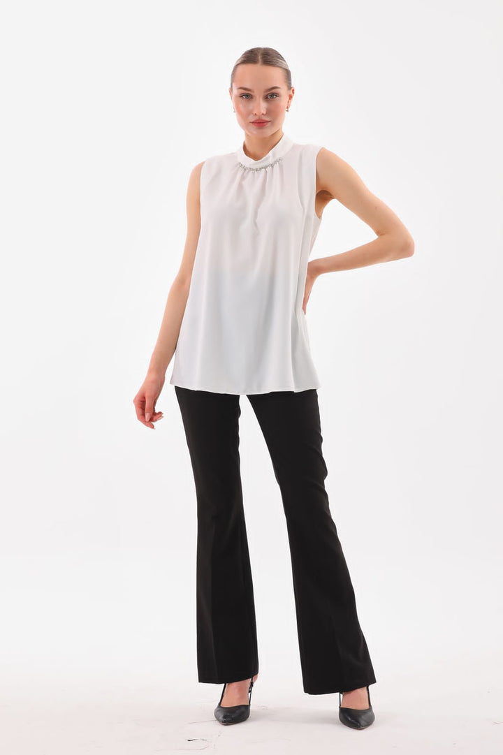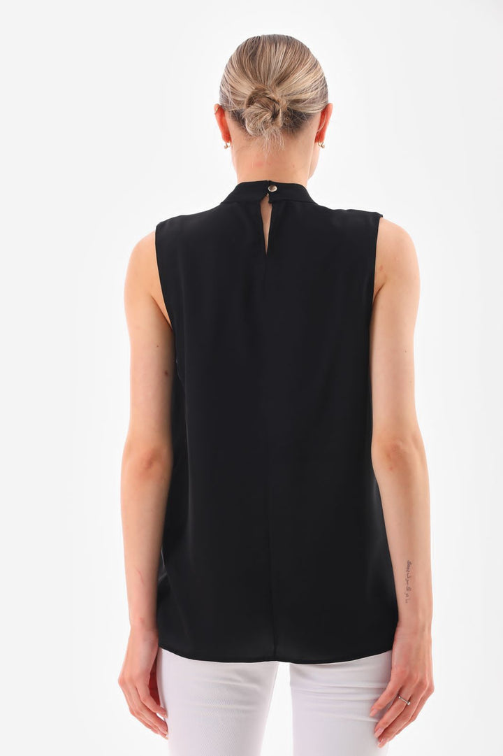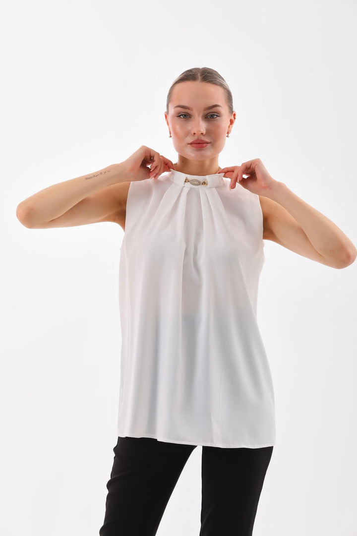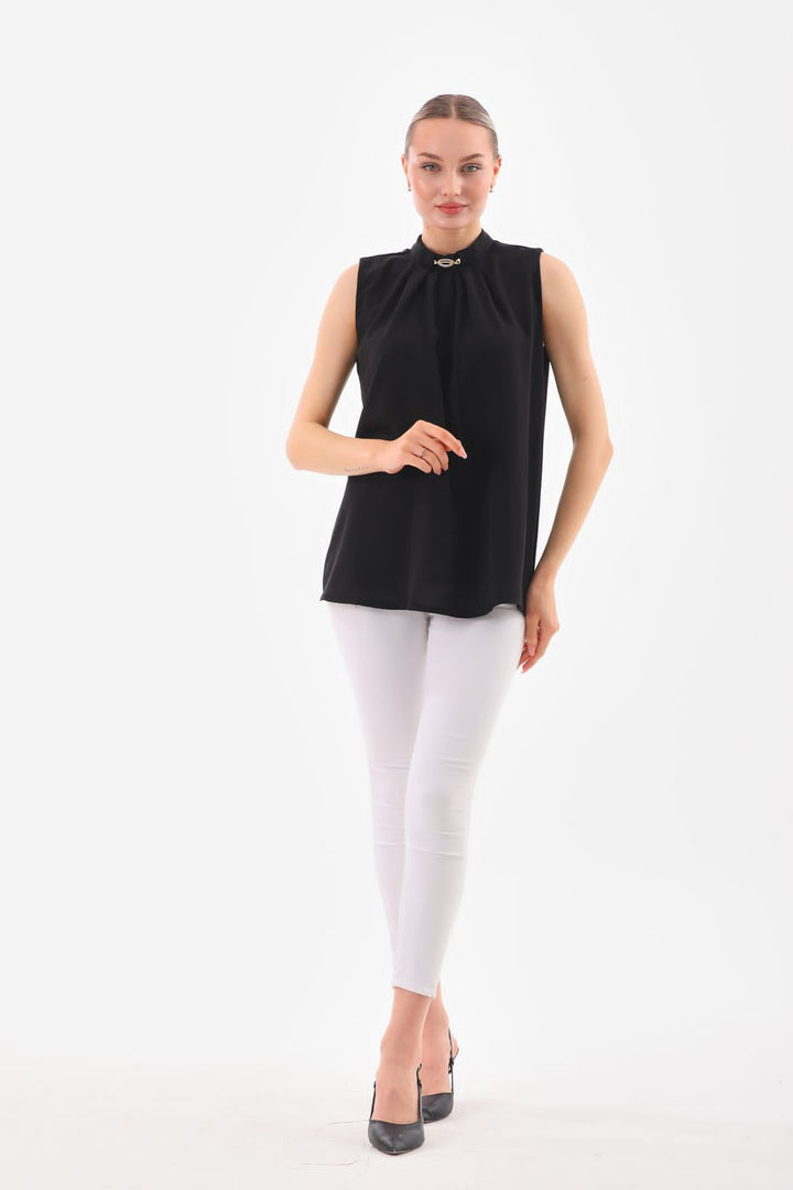 بلوزة ناعمة وخفيفة بدون أكمام، بتصميم أمامي مطوي وتفصيلة ذهبية أنيقة عند الرقبة. مصنوعة من قماش مريح وخفيف يناسب الاستخدام اليومي. بقصّة واسعة تناسب مختلف الأجسام، يمكن ارتداؤها بمفردها أو كقطعة داخلية.