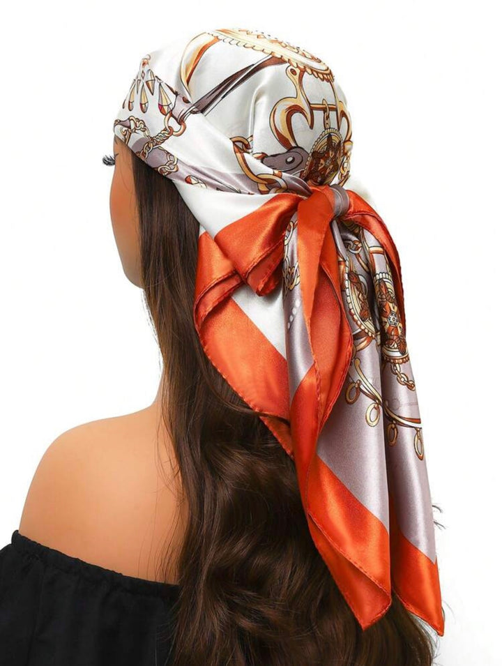 Elevate your style with this premium satin headscarf featuring a vintage-inspired chain and gear print in warm orange and soft white tones. Made from smooth, high-quality satin, this scarf offers a silky touch and a vibrant shine that complements any outfit. Perfect for headwraps, neck ties, or accessorizing your handbag. Lightweight and easy to style, it’s a must-have addition to your fashion collection.
