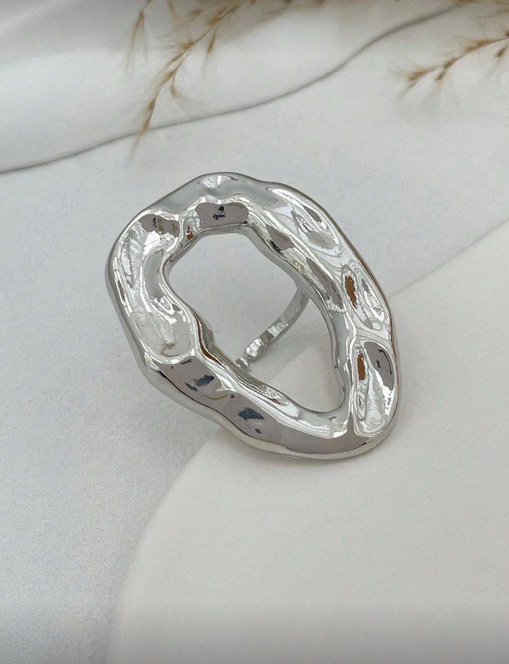 This elegant silver ring features a bold, abstract design with an irregular organic shape that reflects modern minimalism. Crafted with a smooth, polished finish, it captures the beauty of fluid lines and natural textures, making it both contemporary and timeless. Perfect for adding a touch of sophistication to everyday outfits or as a statement piece for special occasions, this ring is versatile, chic, and effortlessly stylish