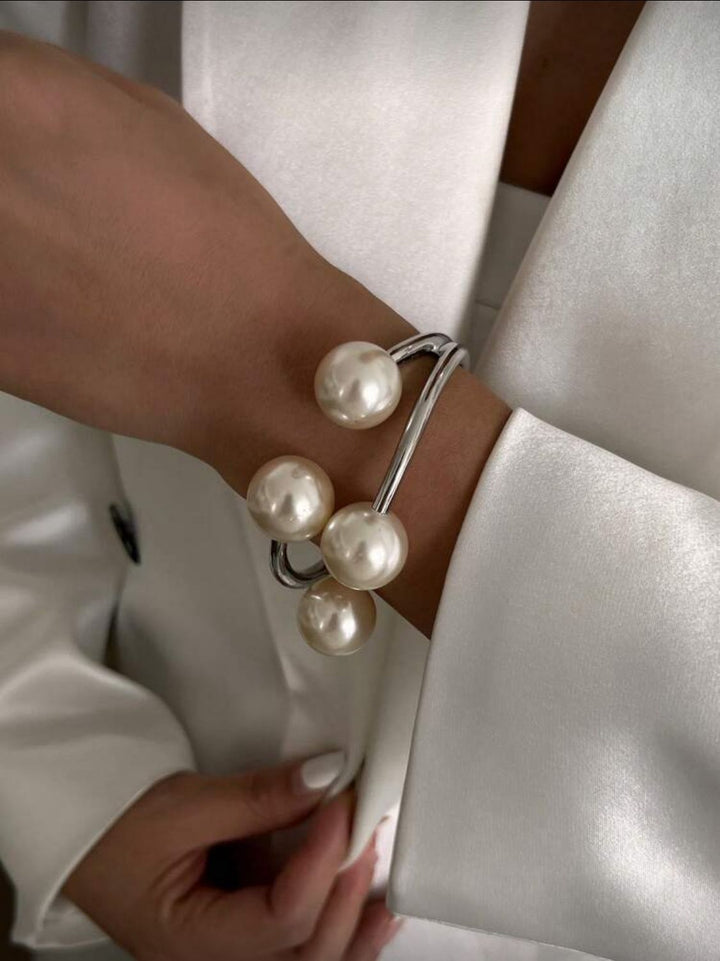 Make an elegant statement with this open silver cuff bracelet, adorned with four luminous faux pearls. Its minimalist yet bold design offers a modern twist on classic elegance, making it the ideal accessory for formal occasions or chic everyday wear