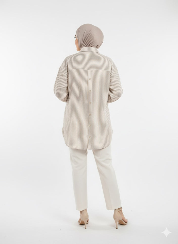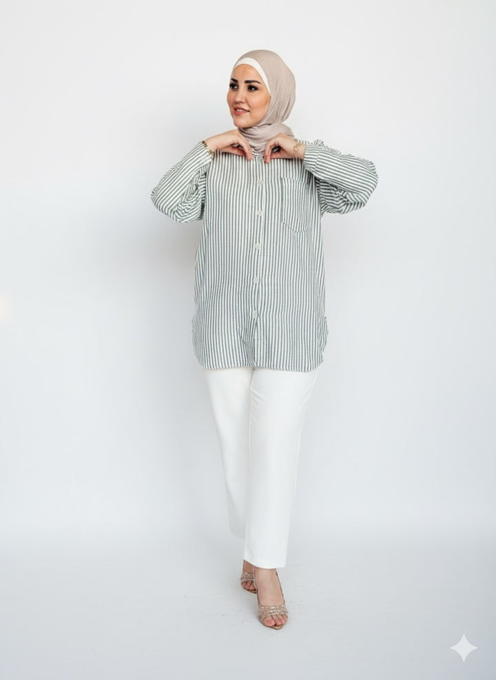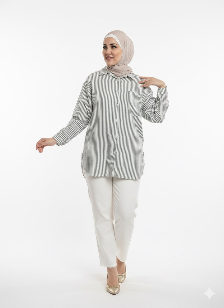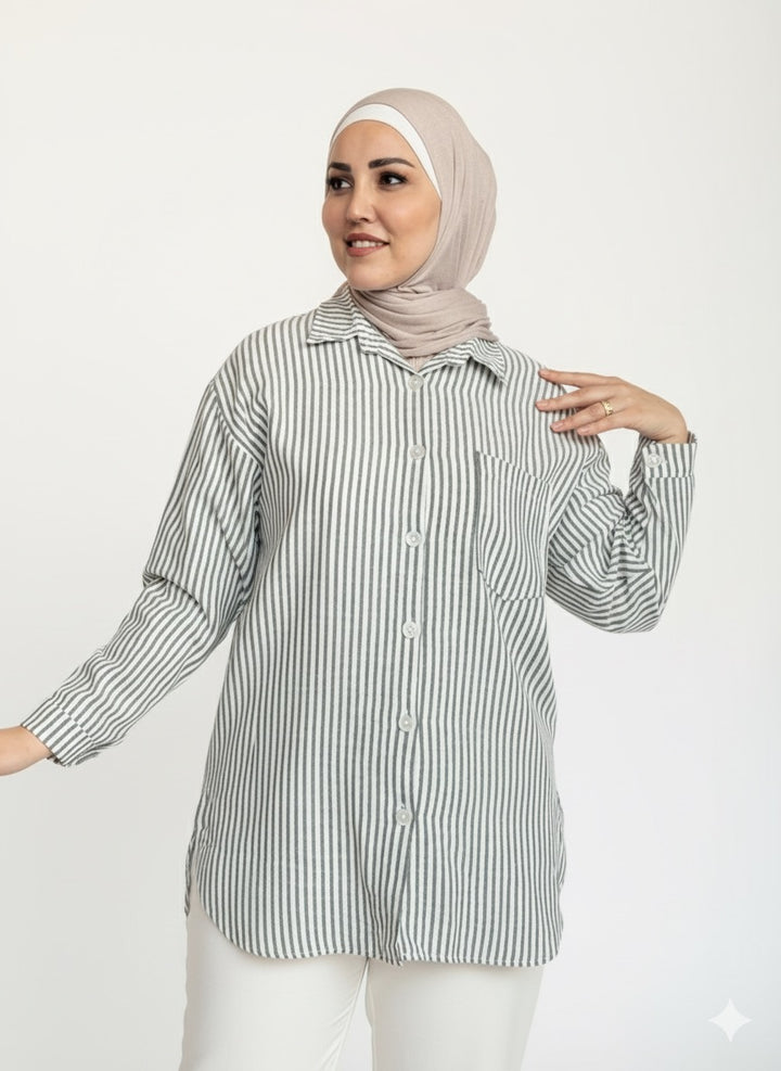 قميص واسع ومريح بأزرار، يتميز بخطوط عمودية أنيقة لإطلالة بحرية خالدة. مصنوع من قماش خفيف الوزن بقصة مريحة، وجيب على الصدر، وحاشية منحنية، مثالي للارتداء فوق طبقات متعددة أو لإطلالة أنيقة غير رسمية.