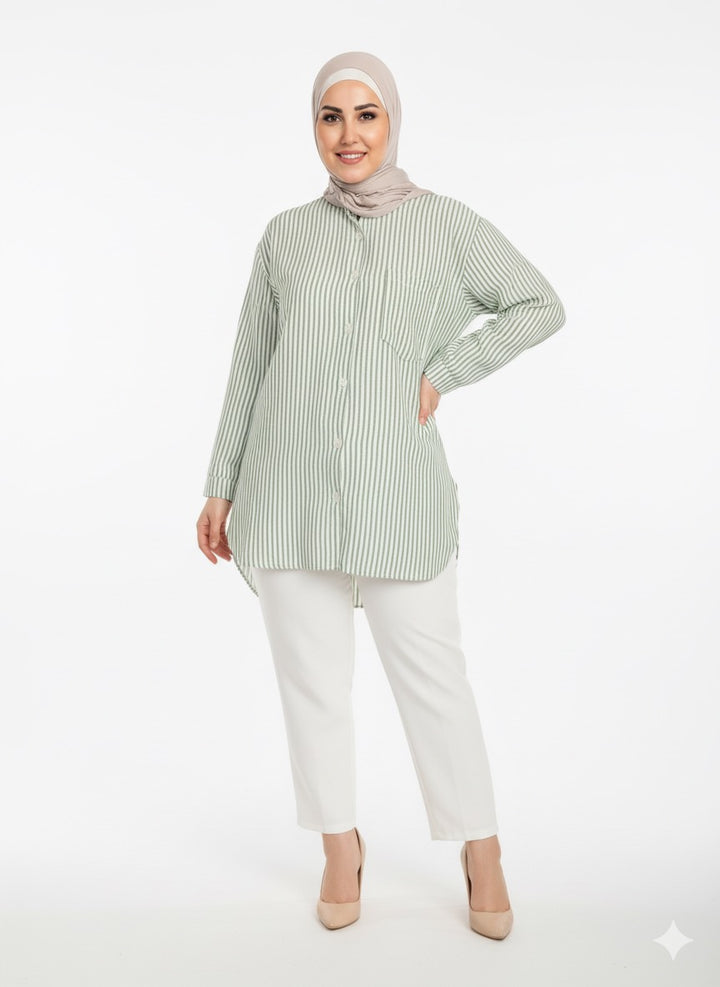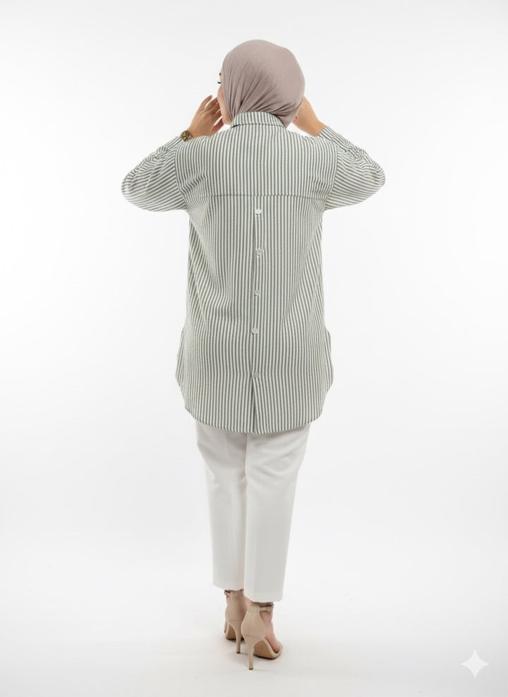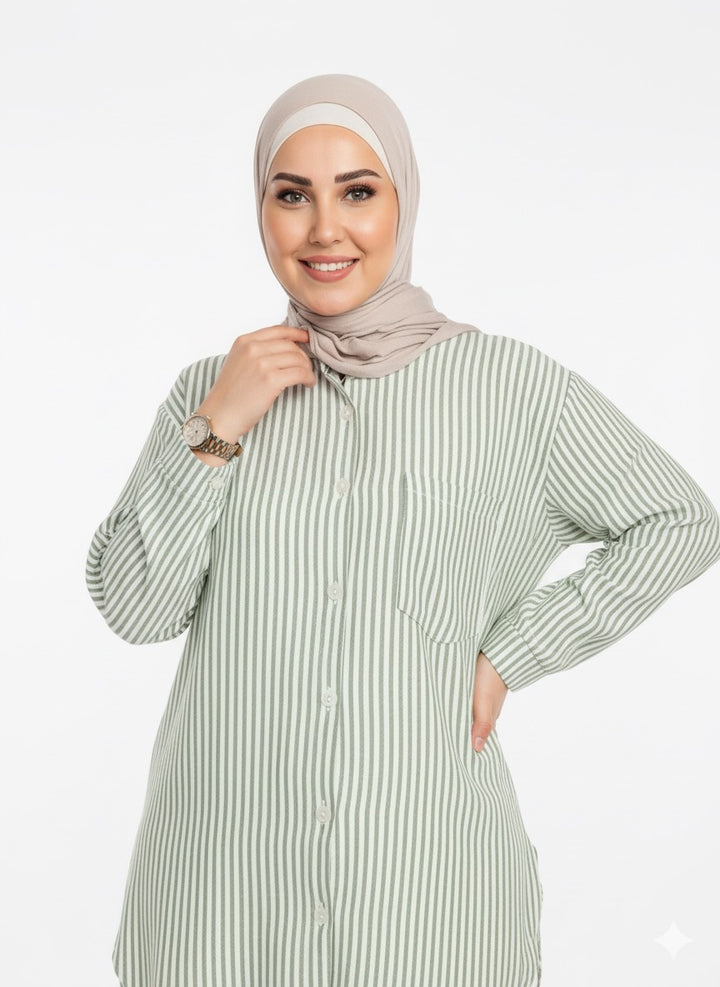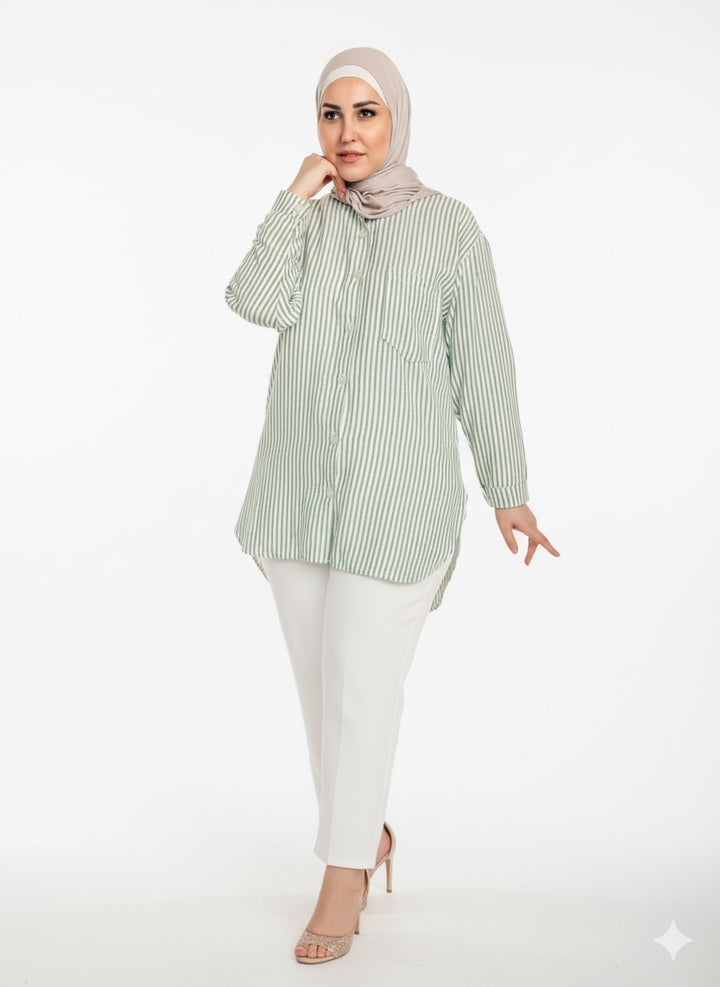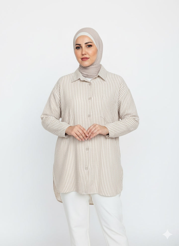 قميص واسع ومريح بأزرار، يتميز بخطوط عمودية أنيقة لإطلالة بحرية خالدة. مصنوع من قماش خفيف الوزن بقصة مريحة، وجيب على الصدر، وحاشية منحنية، مثالي للارتداء فوق طبقات متعددة أو لإطلالة أنيقة غير رسمية.