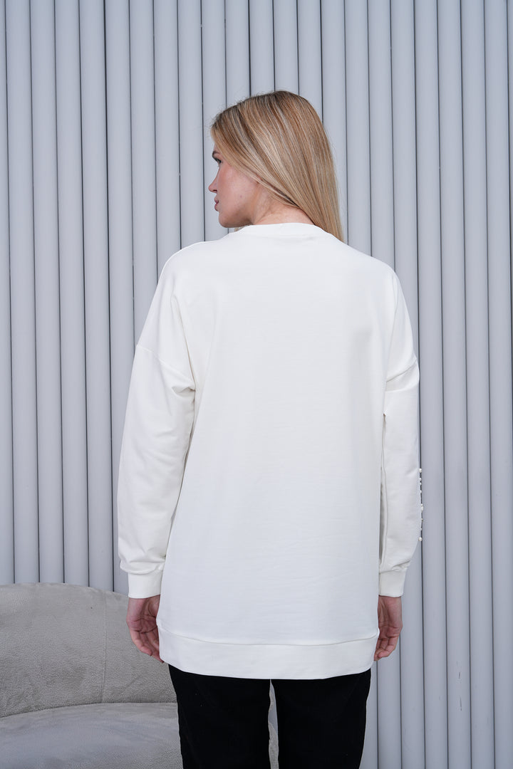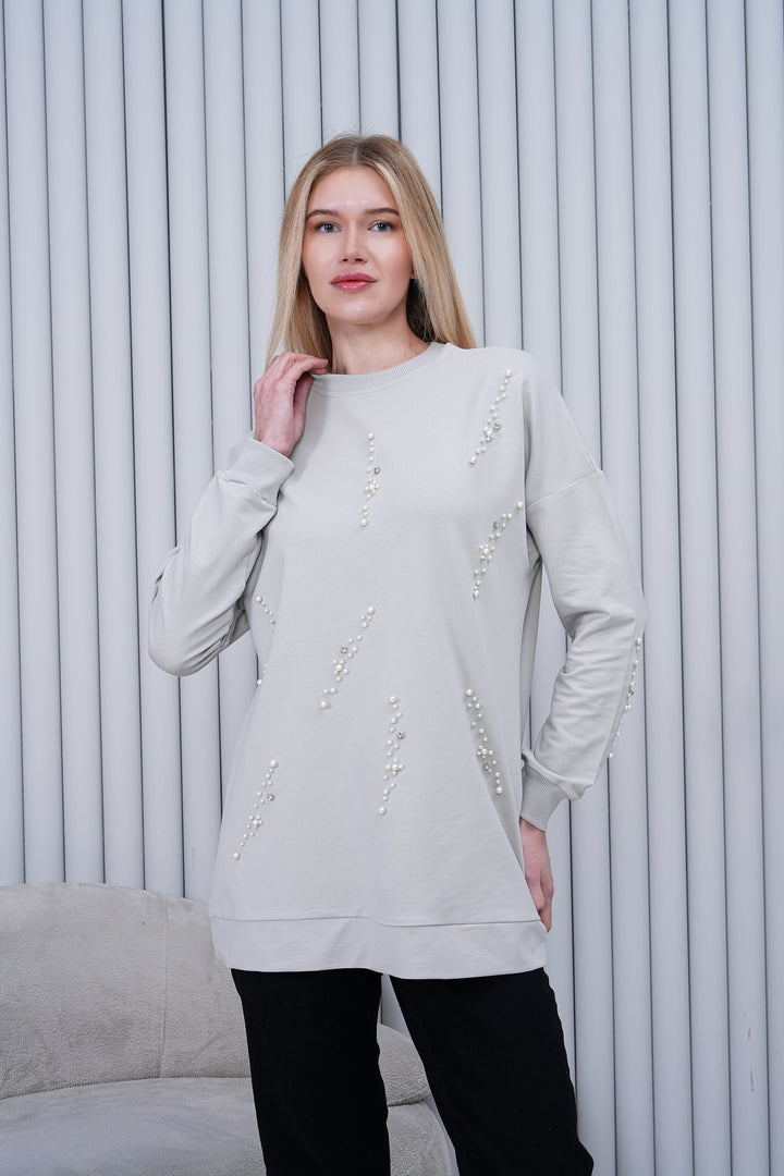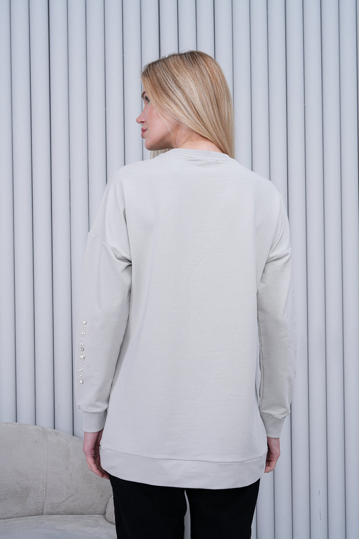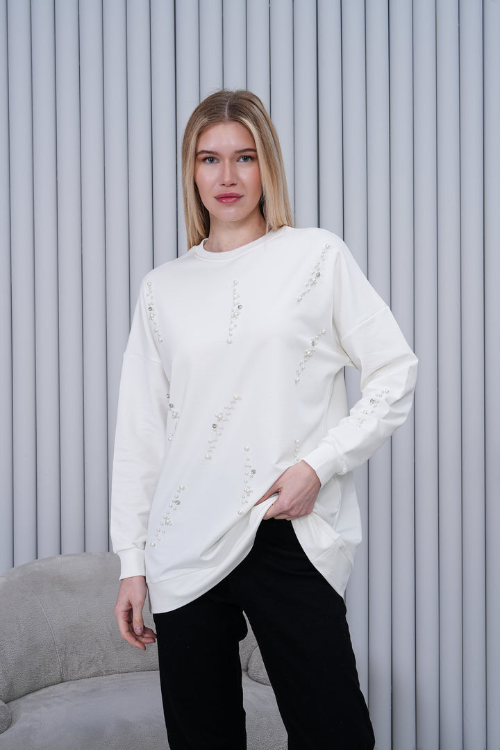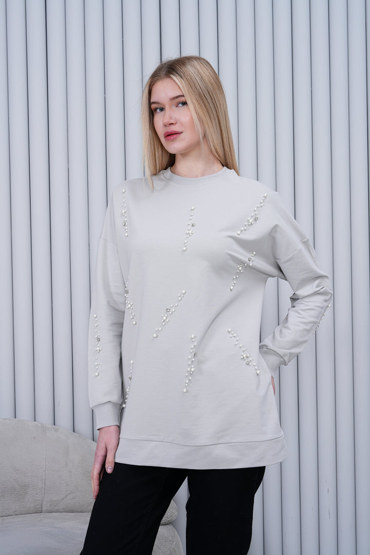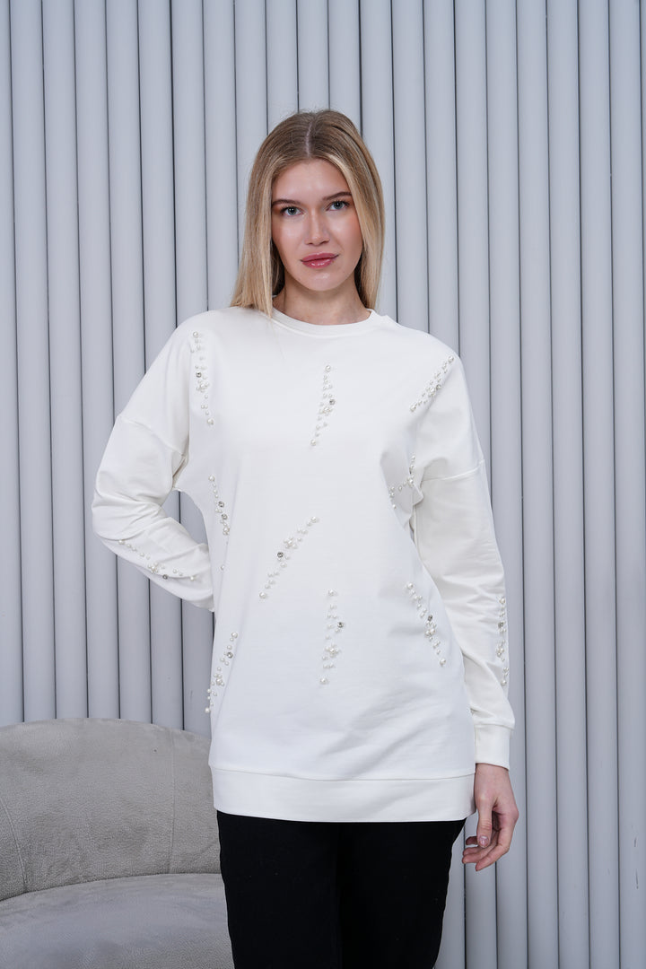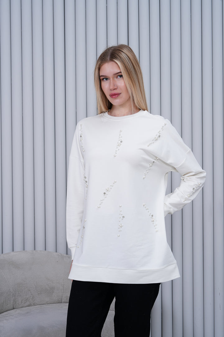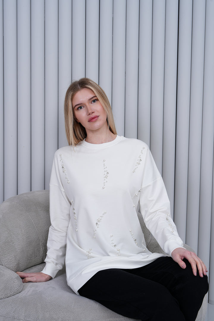سويت شيرت أنيق مزين بتفاصيل لؤلؤية ناعمة على الأمام والأكمام، تضيف لمسة أنثوية راقية. مصنوع من قماش متوسط السماكة وناعم لراحة وأناقة في نفس الوقت. مثالي لإطلالة كاجوال بلمسة مميزة. تصميم مريح يناسب الاستخدام اليومي.
