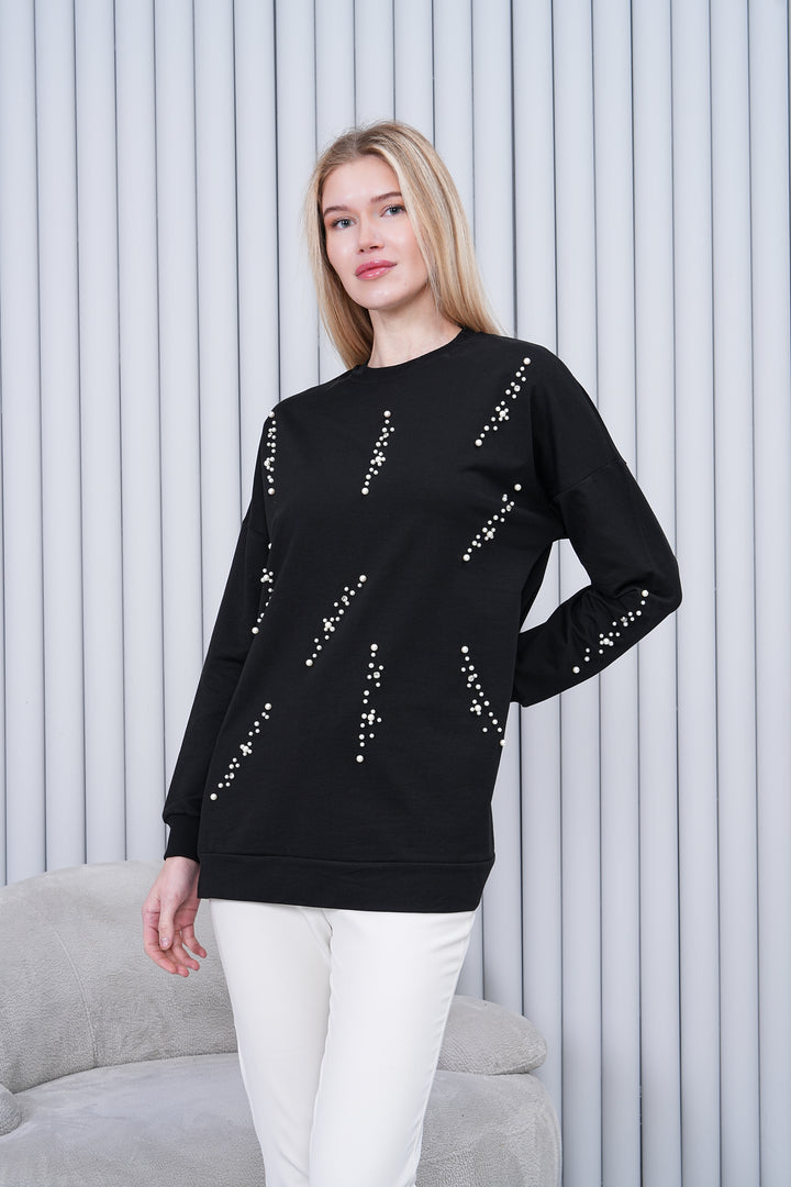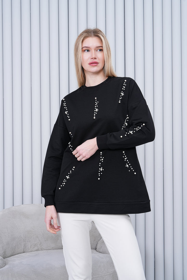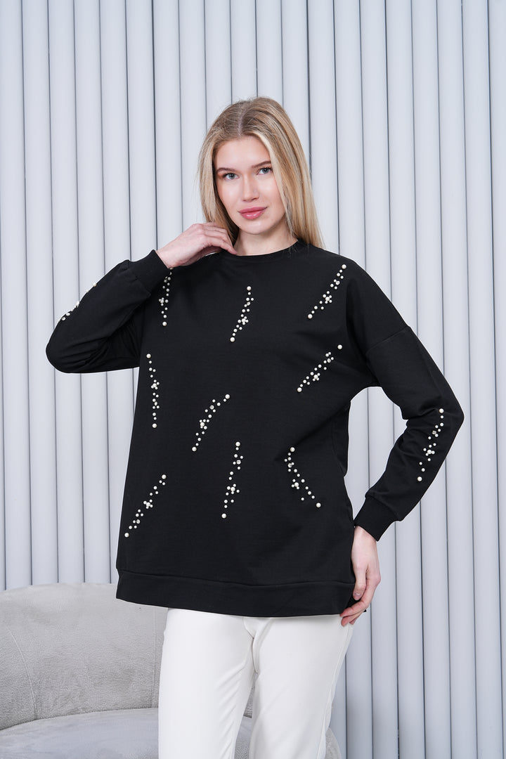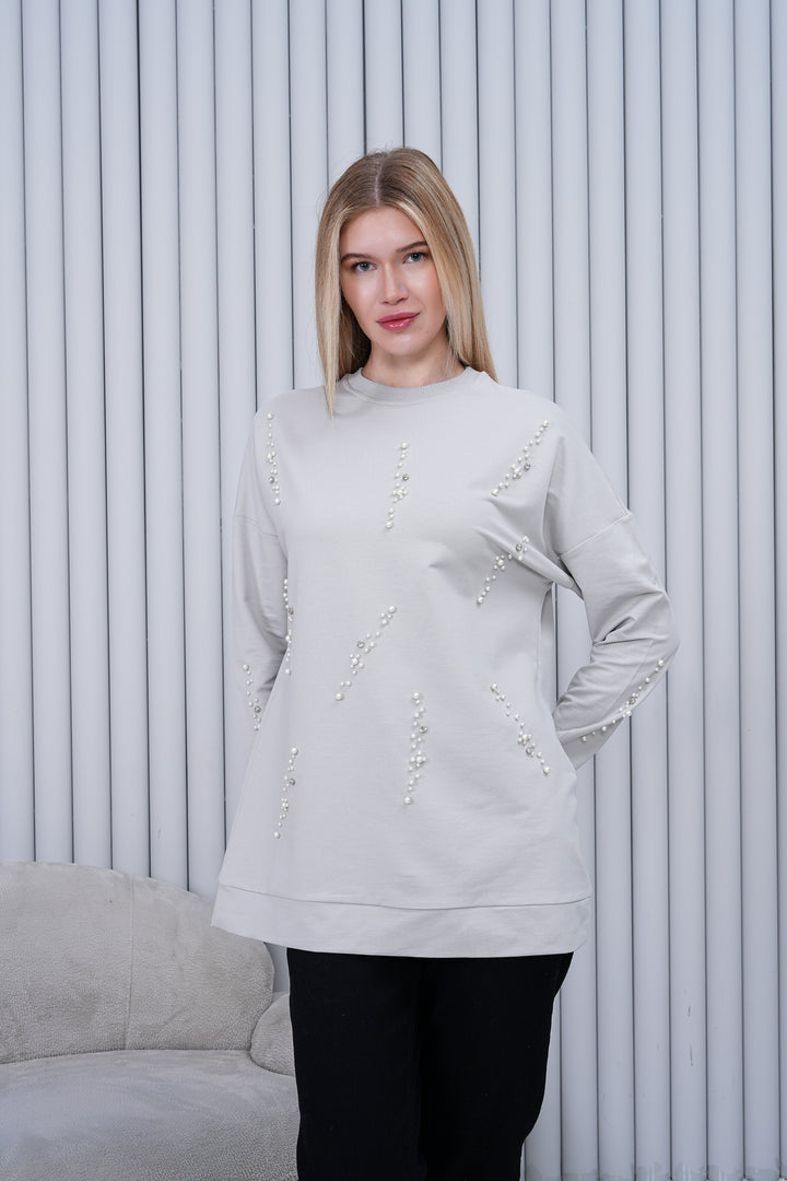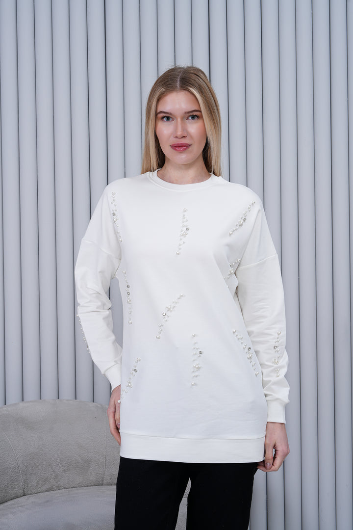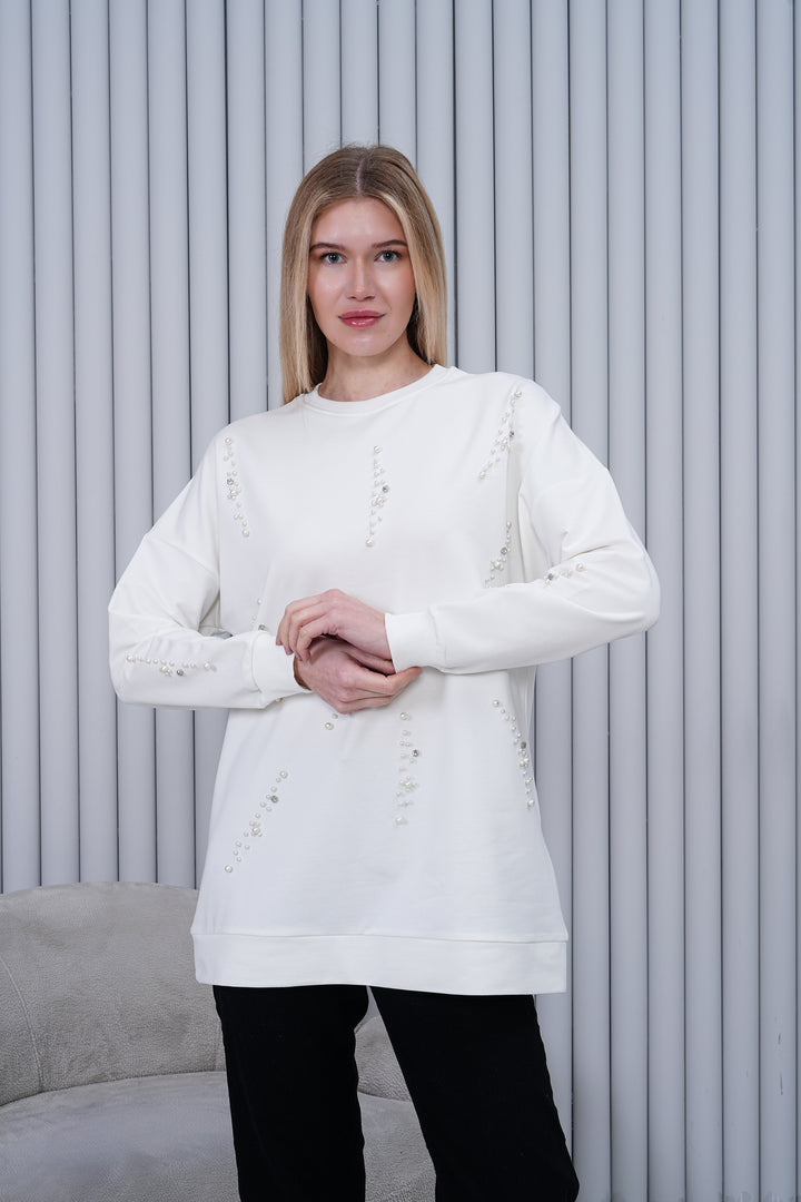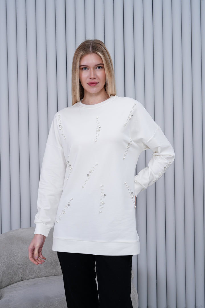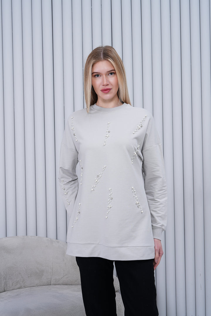 سويت شيرت أنيق مزين بتفاصيل لؤلؤية ناعمة على الأمام والأكمام، تضيف لمسة أنثوية راقية. مصنوع من قماش متوسط السماكة وناعم لراحة وأناقة في نفس الوقت. مثالي لإطلالة كاجوال بلمسة مميزة. تصميم مريح يناسب الاستخدام اليومي.