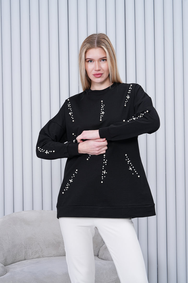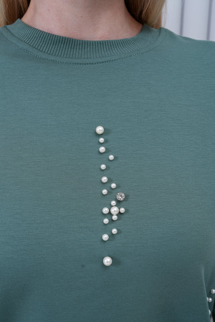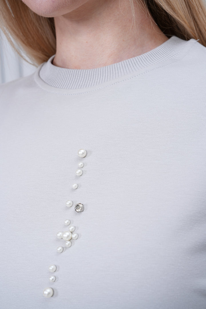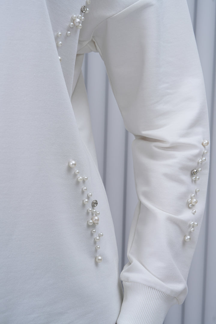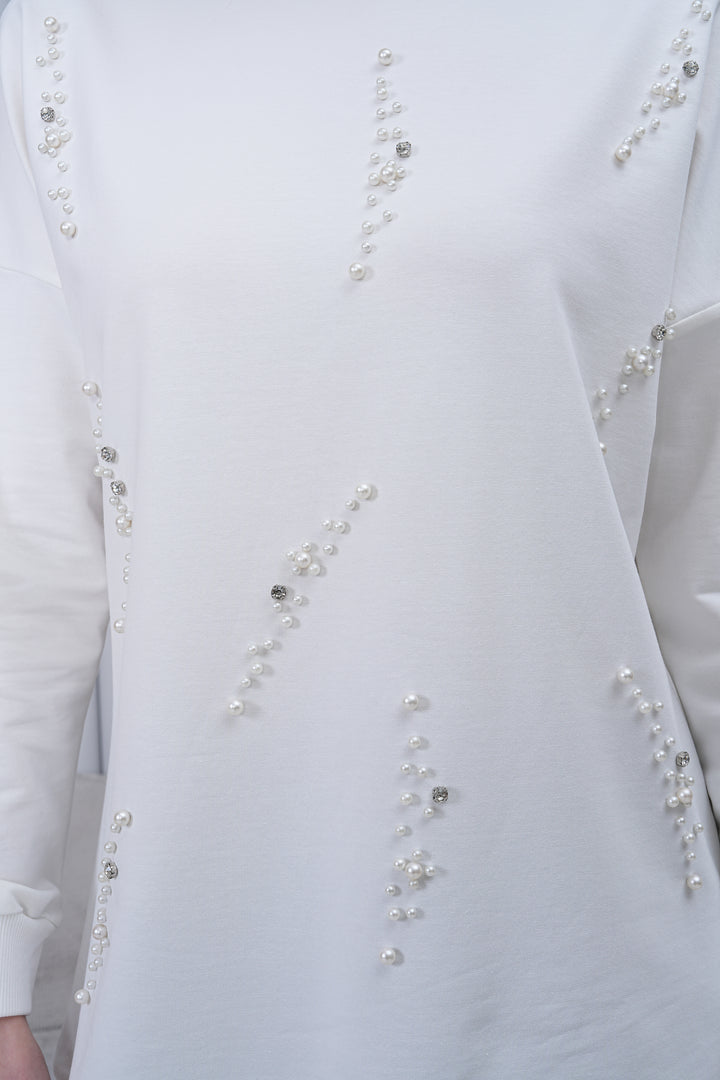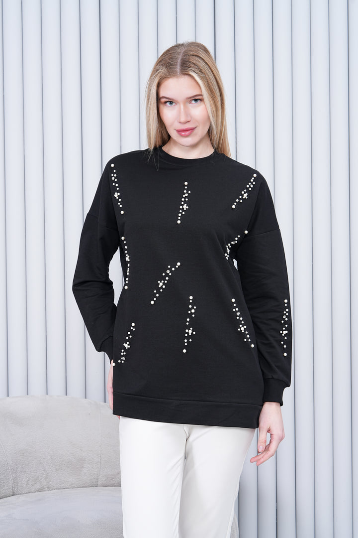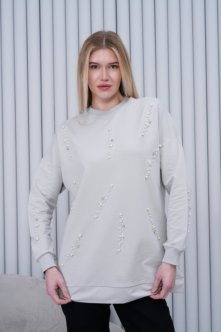 سويت شيرت أنيق مزين بتفاصيل لؤلؤية ناعمة على الأمام والأكمام، تضيف لمسة أنثوية راقية. مصنوع من قماش متوسط السماكة وناعم لراحة وأناقة في نفس الوقت. مثالي لإطلالة كاجوال بلمسة مميزة. تصميم مريح يناسب الاستخدام اليومي.