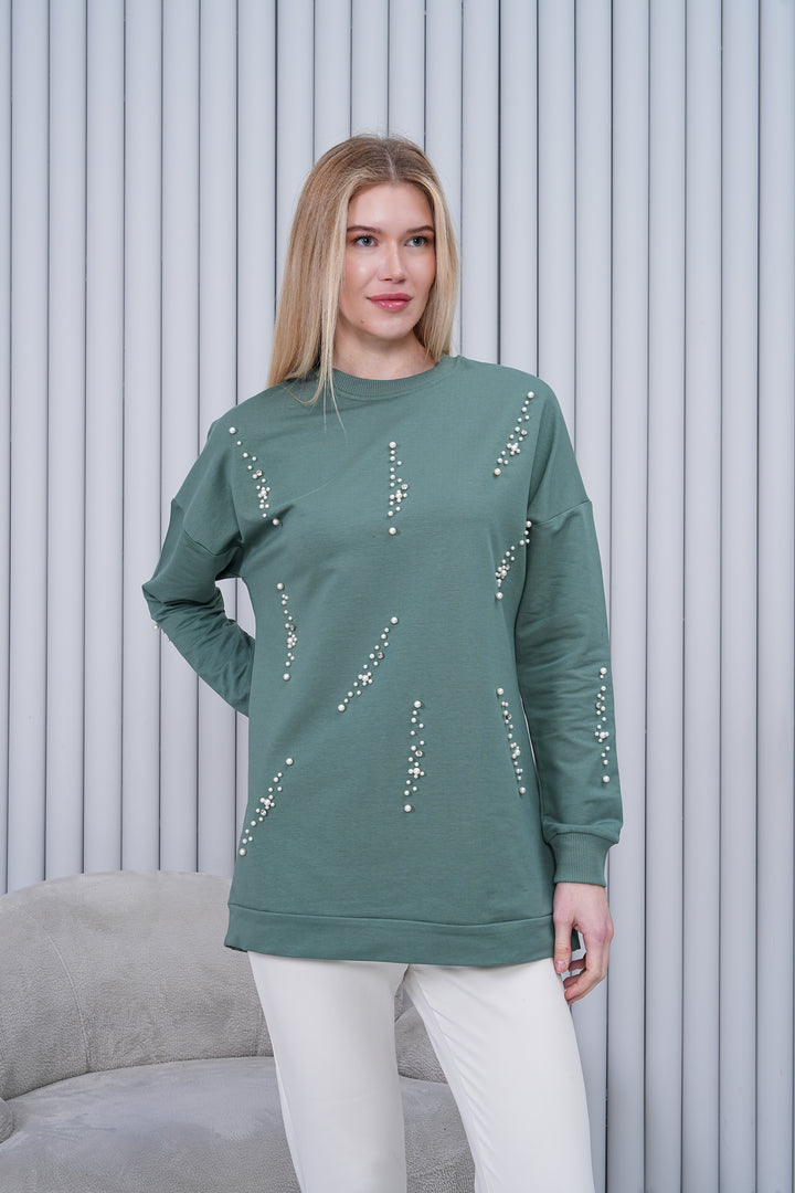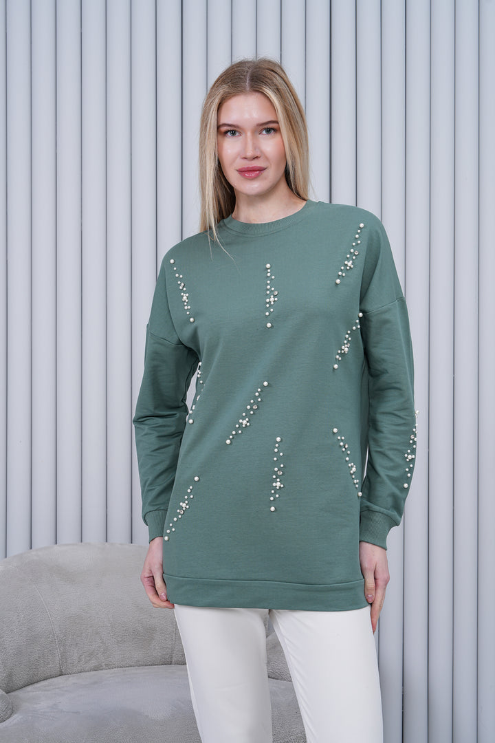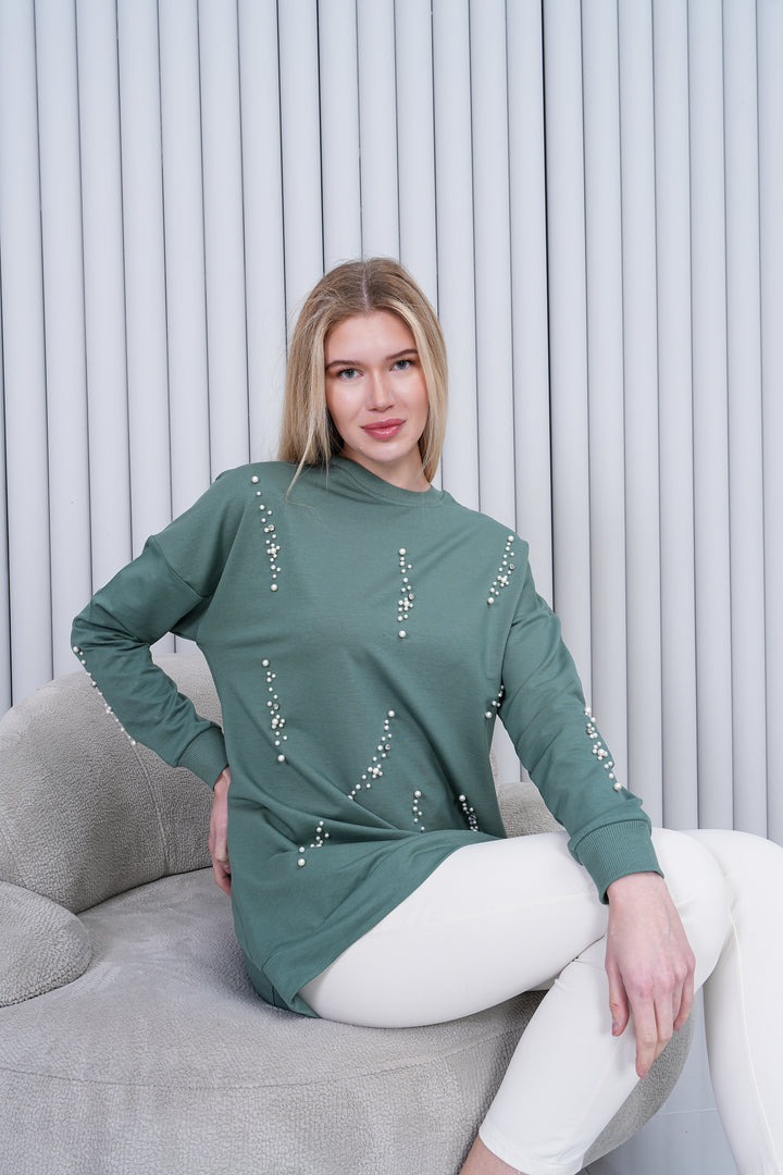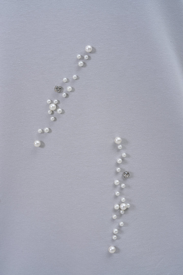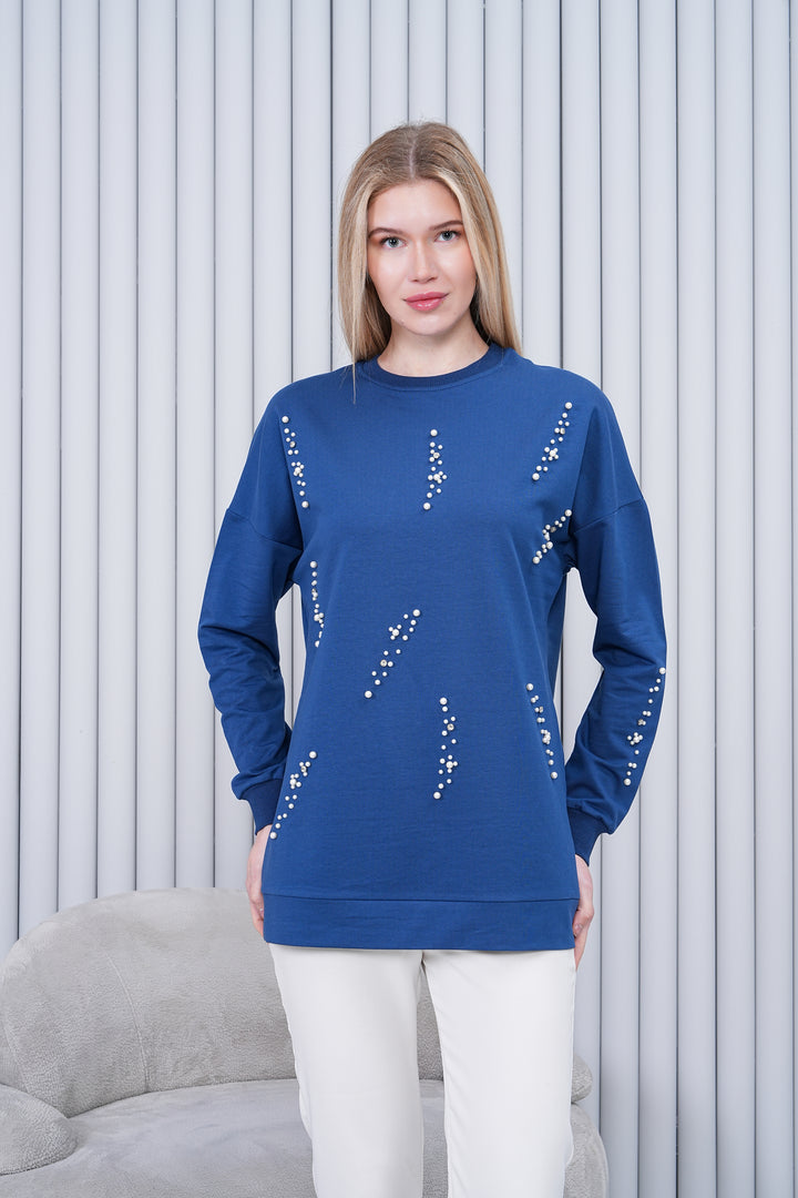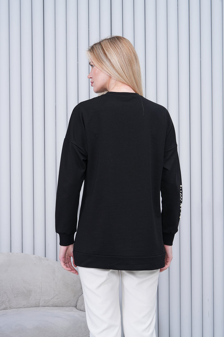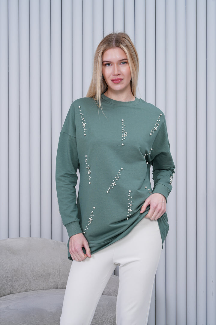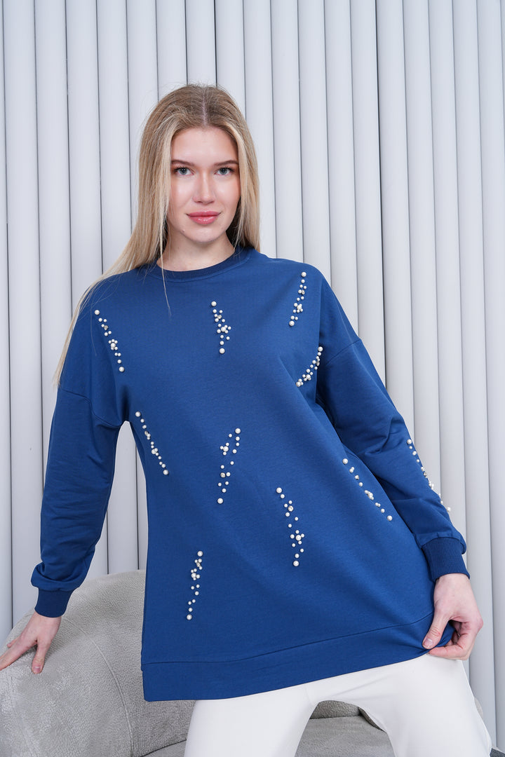 سويت شيرت أنيق مزين بتفاصيل لؤلؤية ناعمة على الأمام والأكمام، تضيف لمسة أنثوية راقية. مصنوع من قماش متوسط السماكة وناعم لراحة وأناقة في نفس الوقت. مثالي لإطلالة كاجوال بلمسة مميزة. تصميم مريح يناسب الاستخدام اليومي.