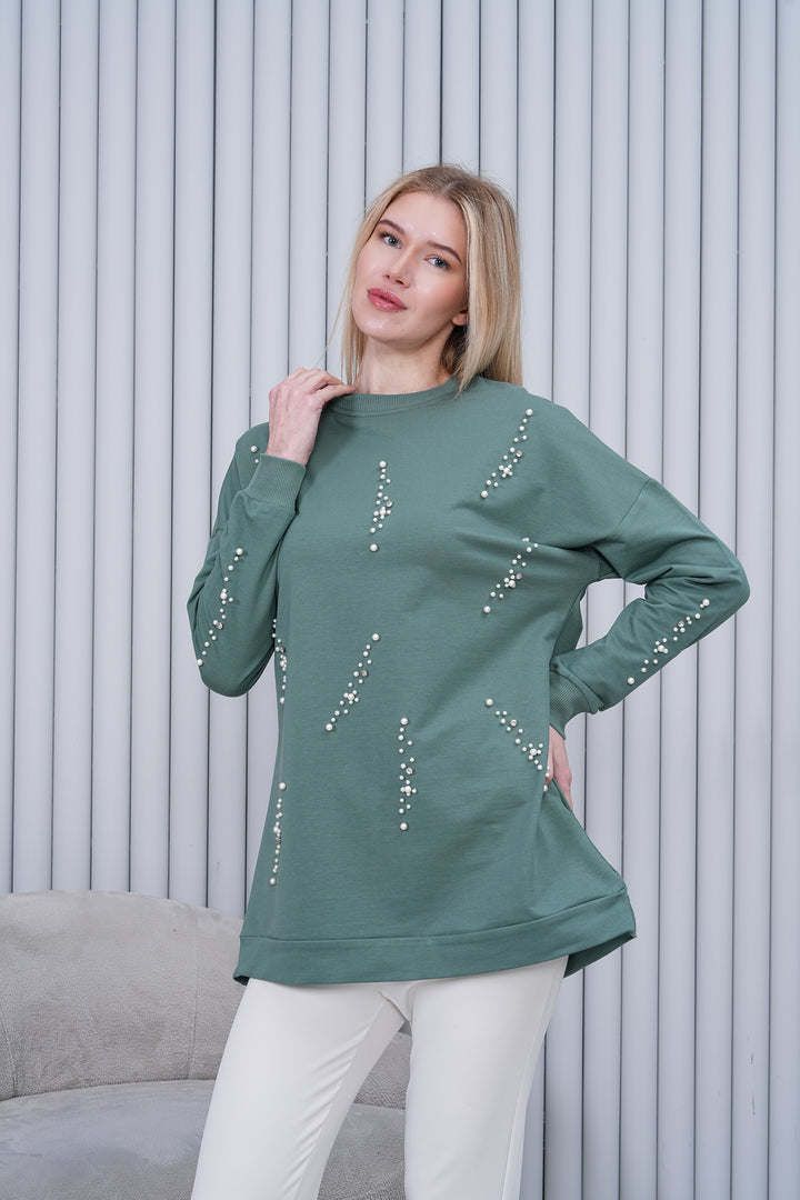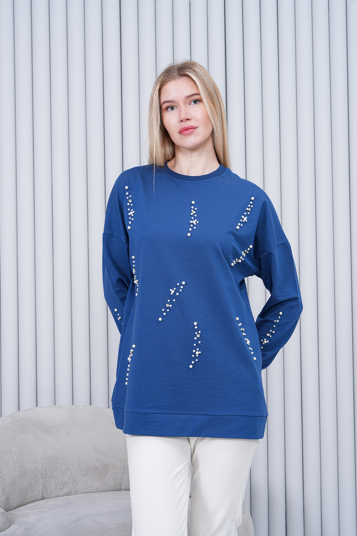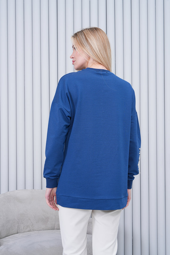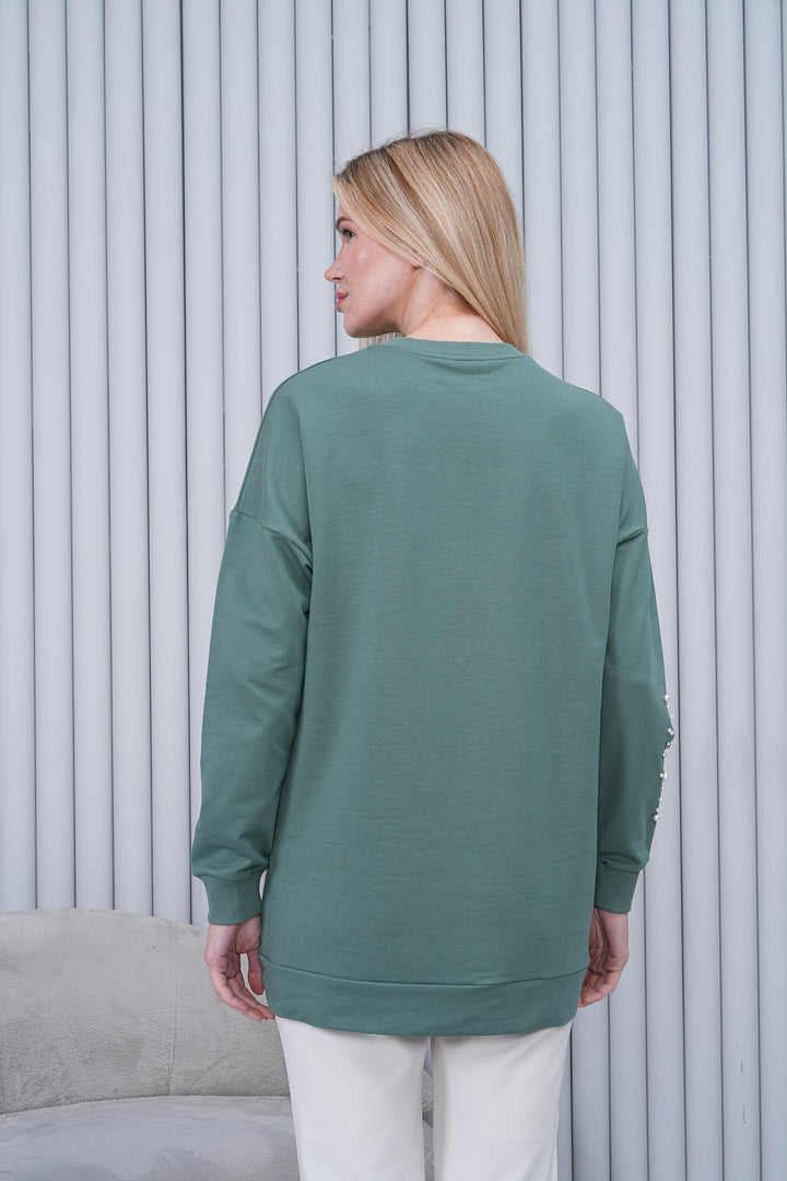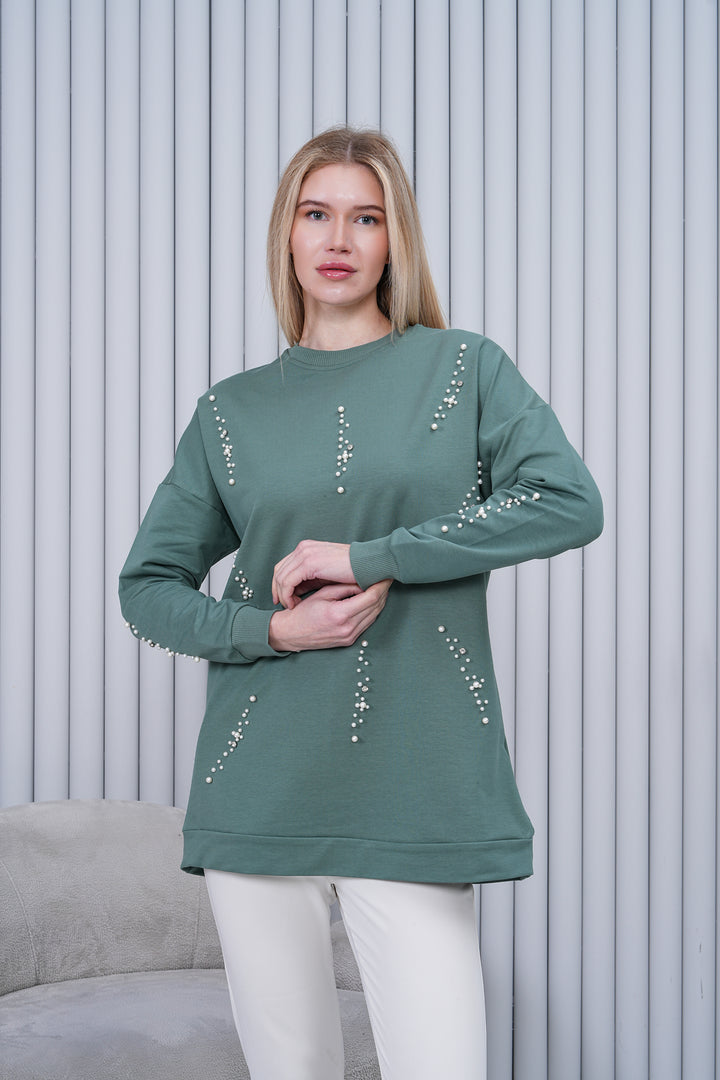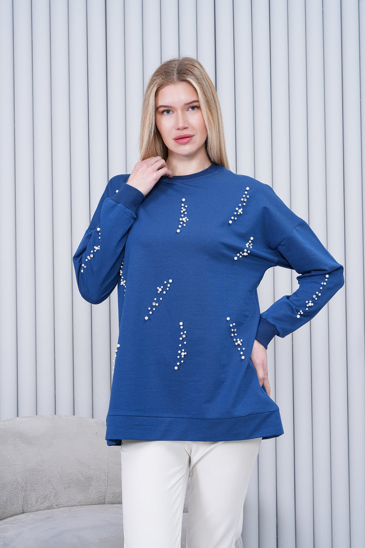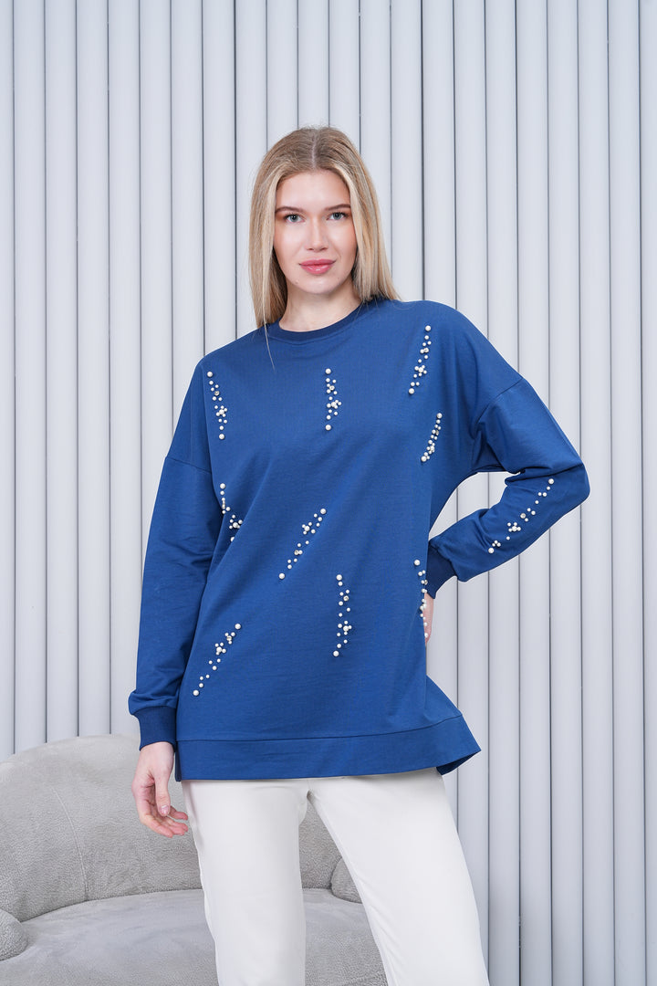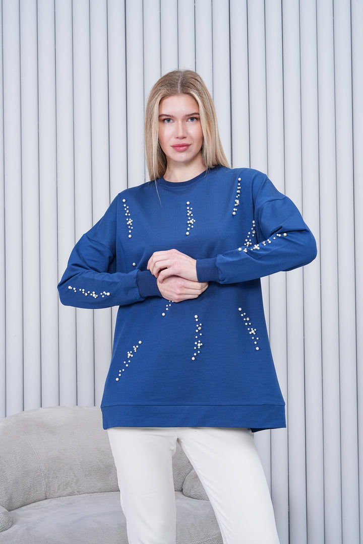 سويت شيرت أنيق مزين بتفاصيل لؤلؤية ناعمة على الأمام والأكمام، تضيف لمسة أنثوية راقية. مصنوع من قماش متوسط السماكة وناعم لراحة وأناقة في نفس الوقت. مثالي لإطلالة كاجوال بلمسة مميزة. تصميم مريح يناسب الاستخدام اليومي.
