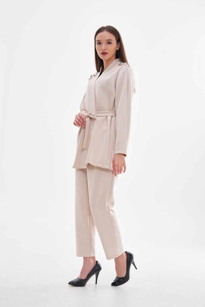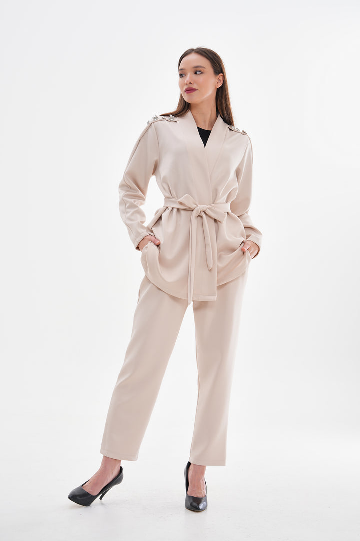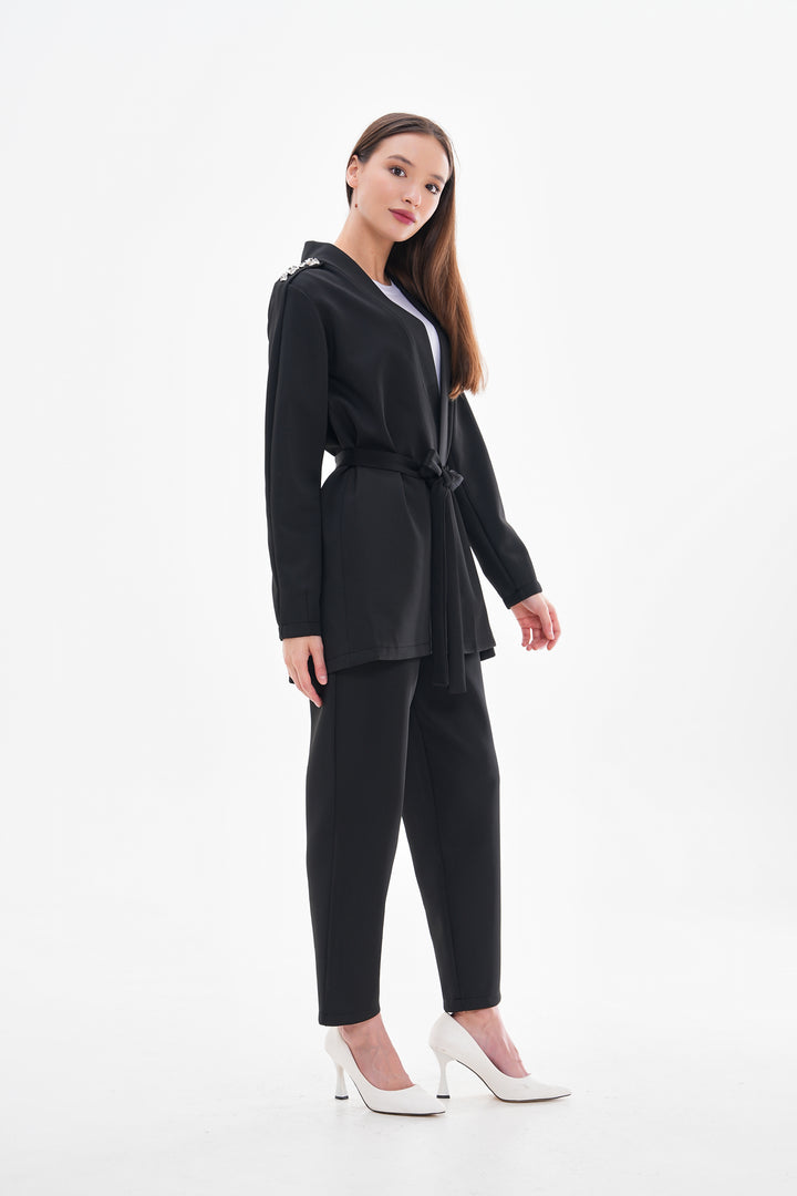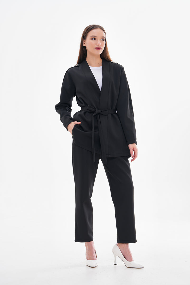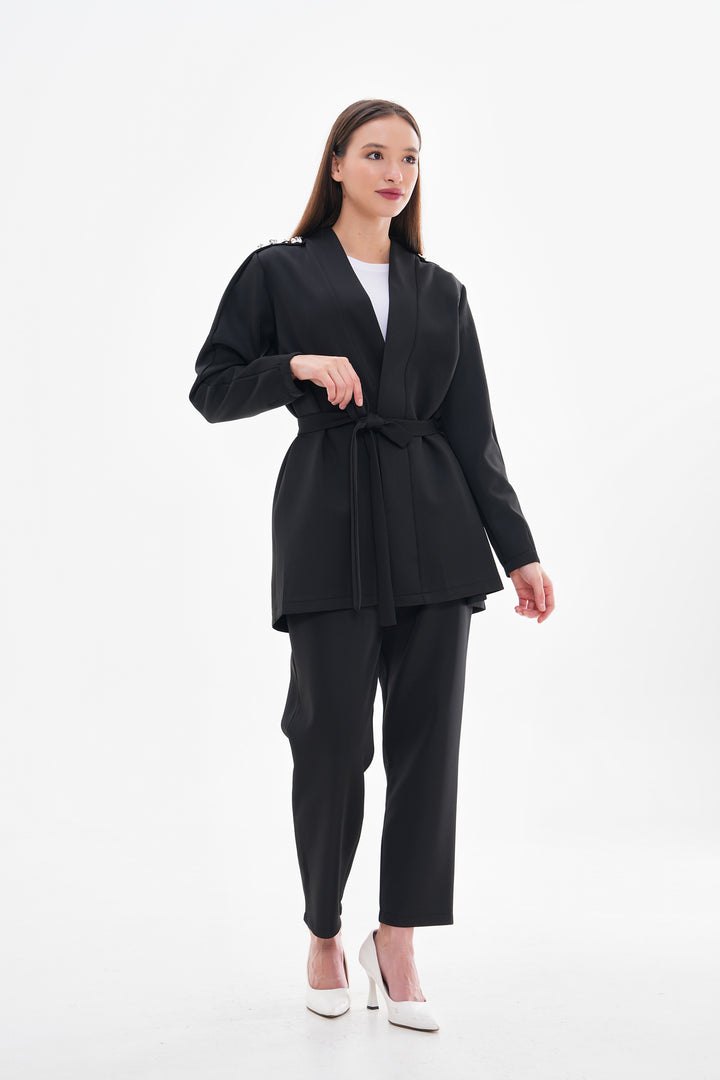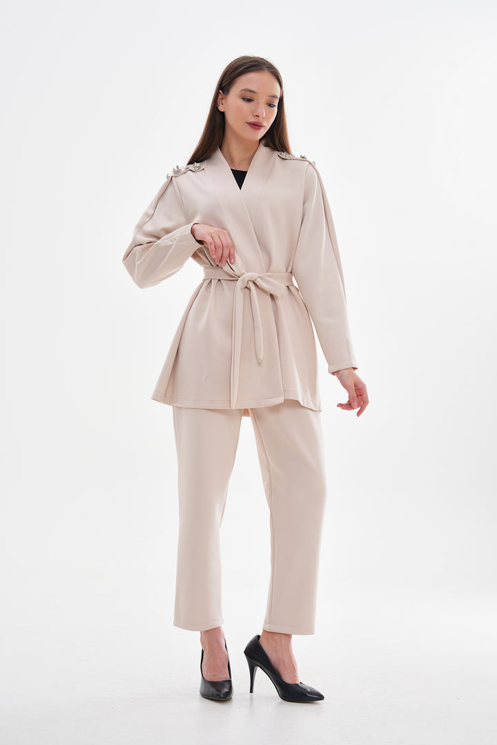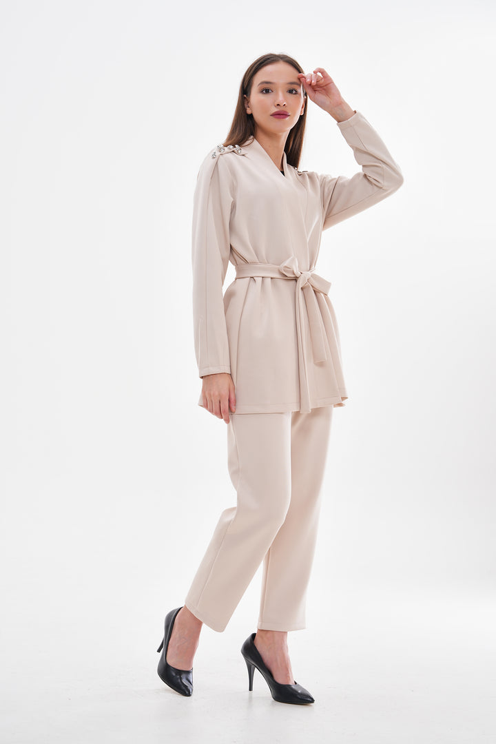 طقم أنيق من قطعتين يتكوّن من توب واسع بحزام يحدد الخصر وتزيين لامع على الأكتاف، مع بنطال متناسق بقصة مستقيمة. مصنوع من قماش ناعم وخفيف يمنحك الراحة والأناقة. خيار مثالي لإطلالة محتشمة بلمسة عصرية أنيقة.