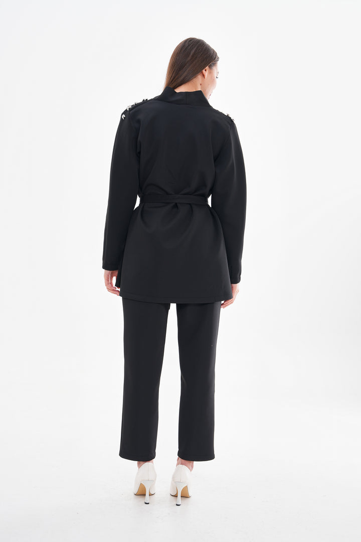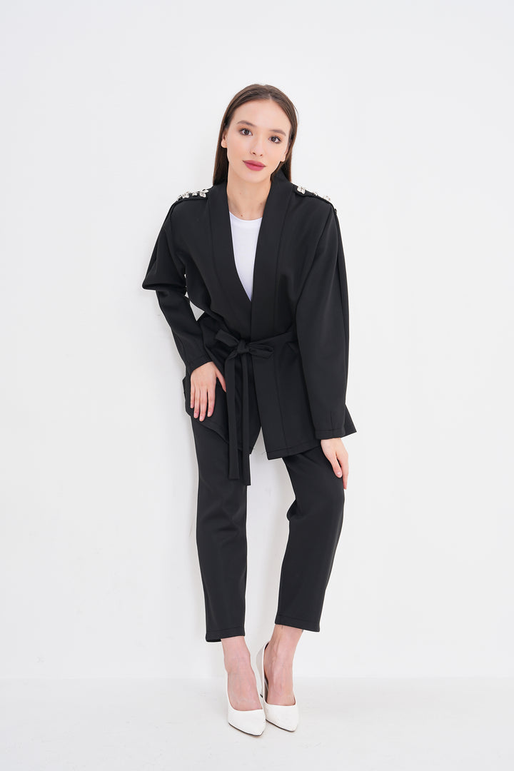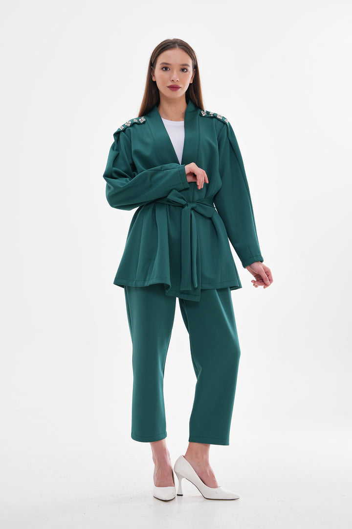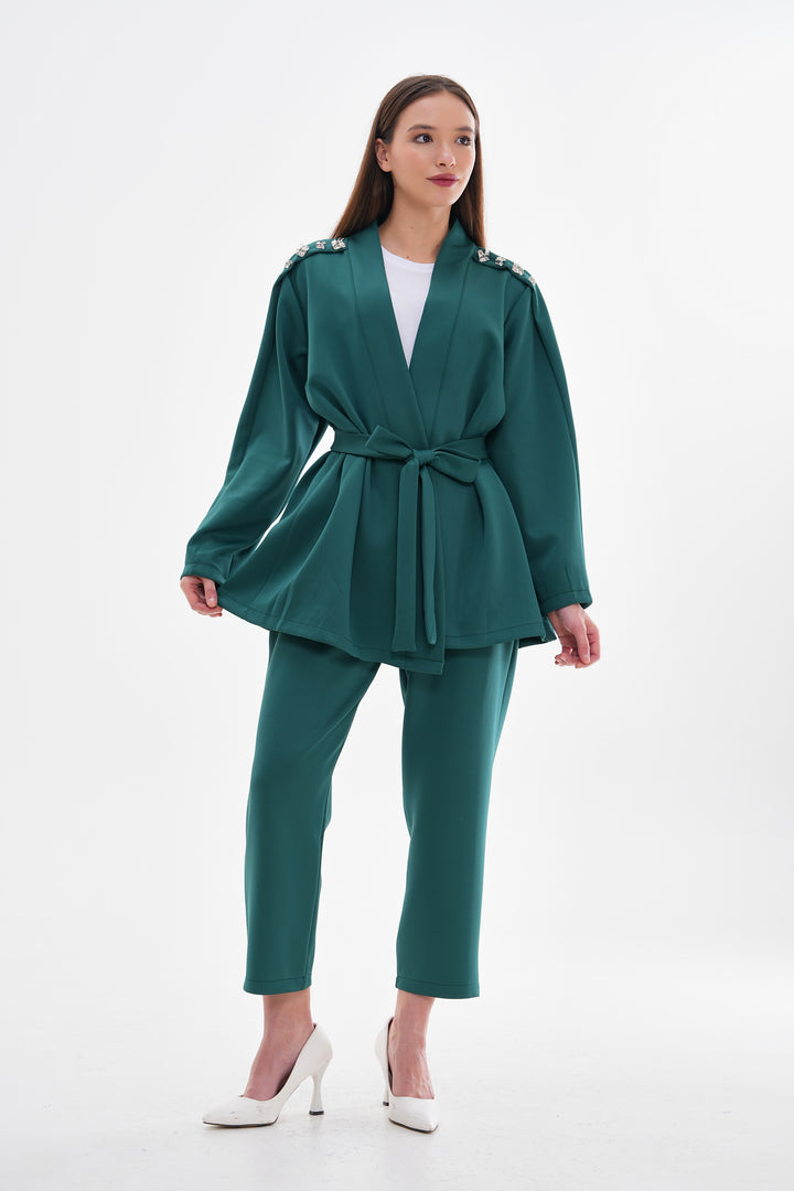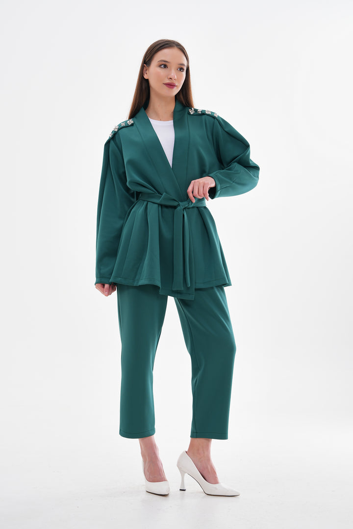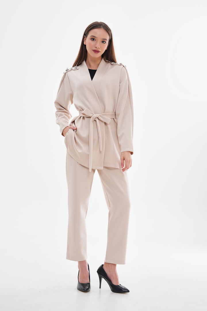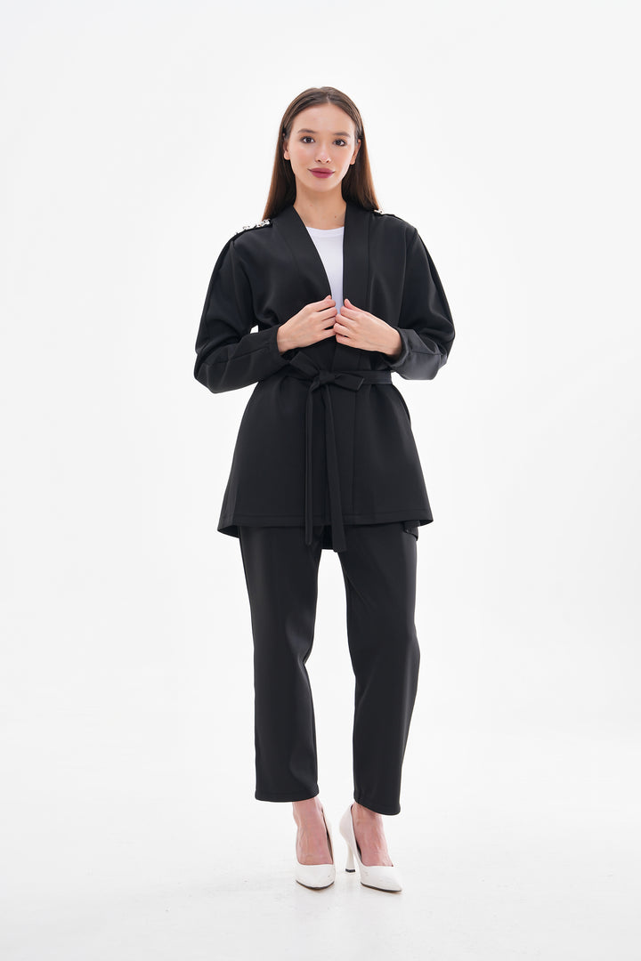 طقم أنيق من قطعتين يتكوّن من توب واسع بحزام يحدد الخصر وتزيين لامع على الأكتاف، مع بنطال متناسق بقصة مستقيمة. مصنوع من قماش ناعم وخفيف يمنحك الراحة والأناقة. خيار مثالي لإطلالة محتشمة بلمسة عصرية أنيقة.
