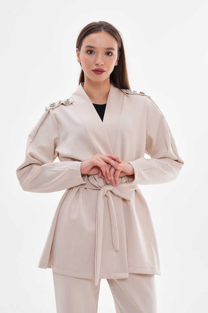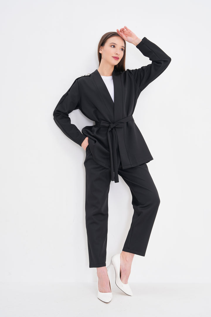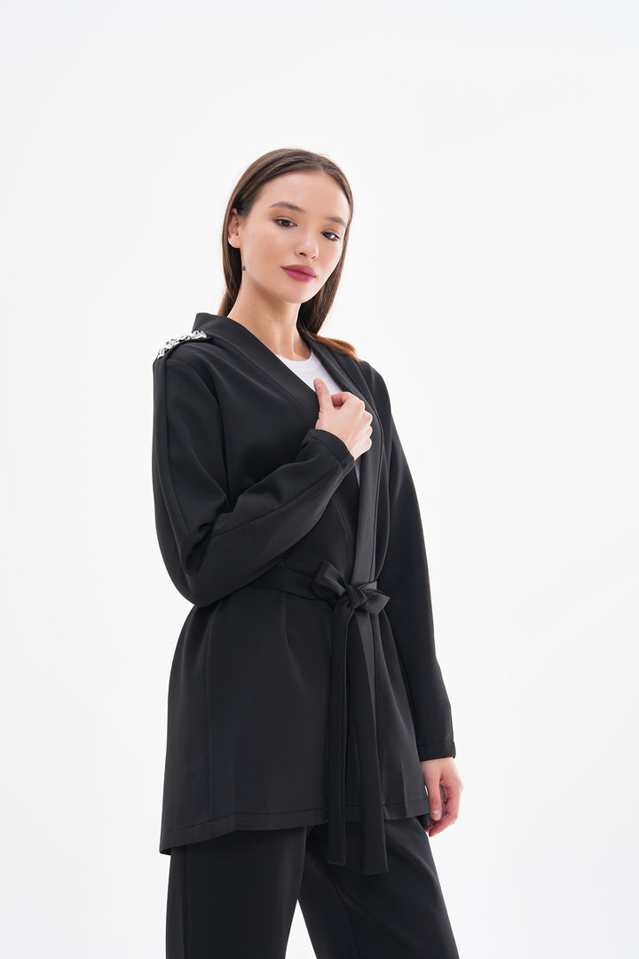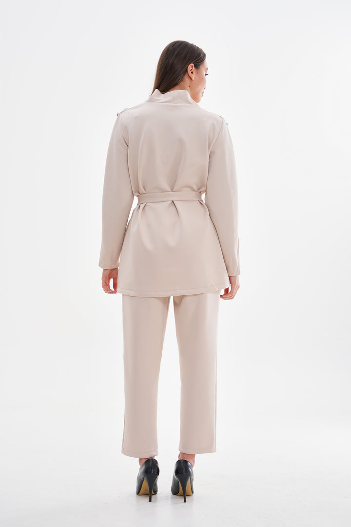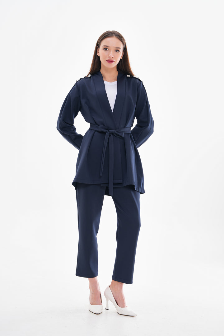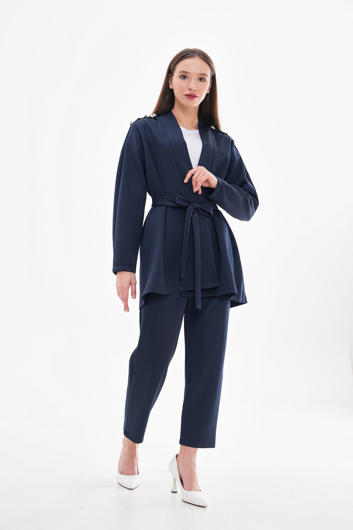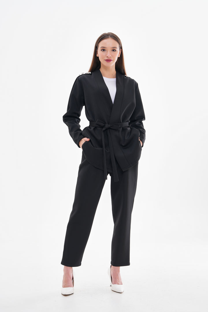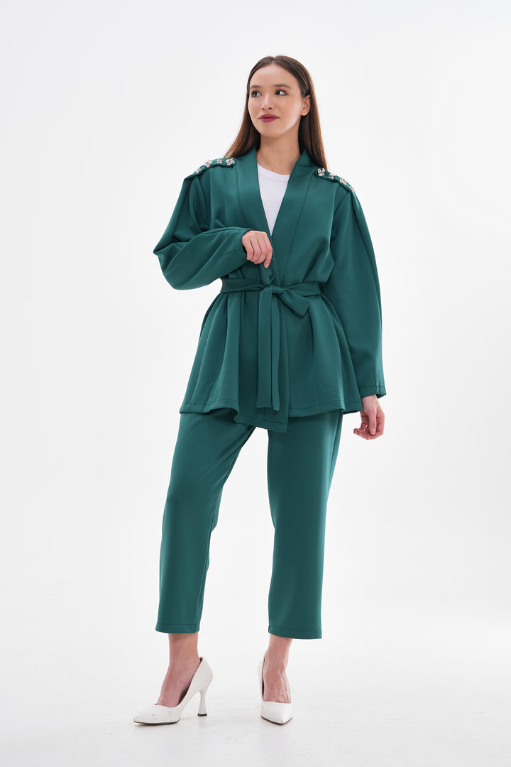 طقم أنيق من قطعتين يتكوّن من توب واسع بحزام يحدد الخصر وتزيين لامع على الأكتاف، مع بنطال متناسق بقصة مستقيمة. مصنوع من قماش ناعم وخفيف يمنحك الراحة والأناقة. خيار مثالي لإطلالة محتشمة بلمسة عصرية أنيقة.