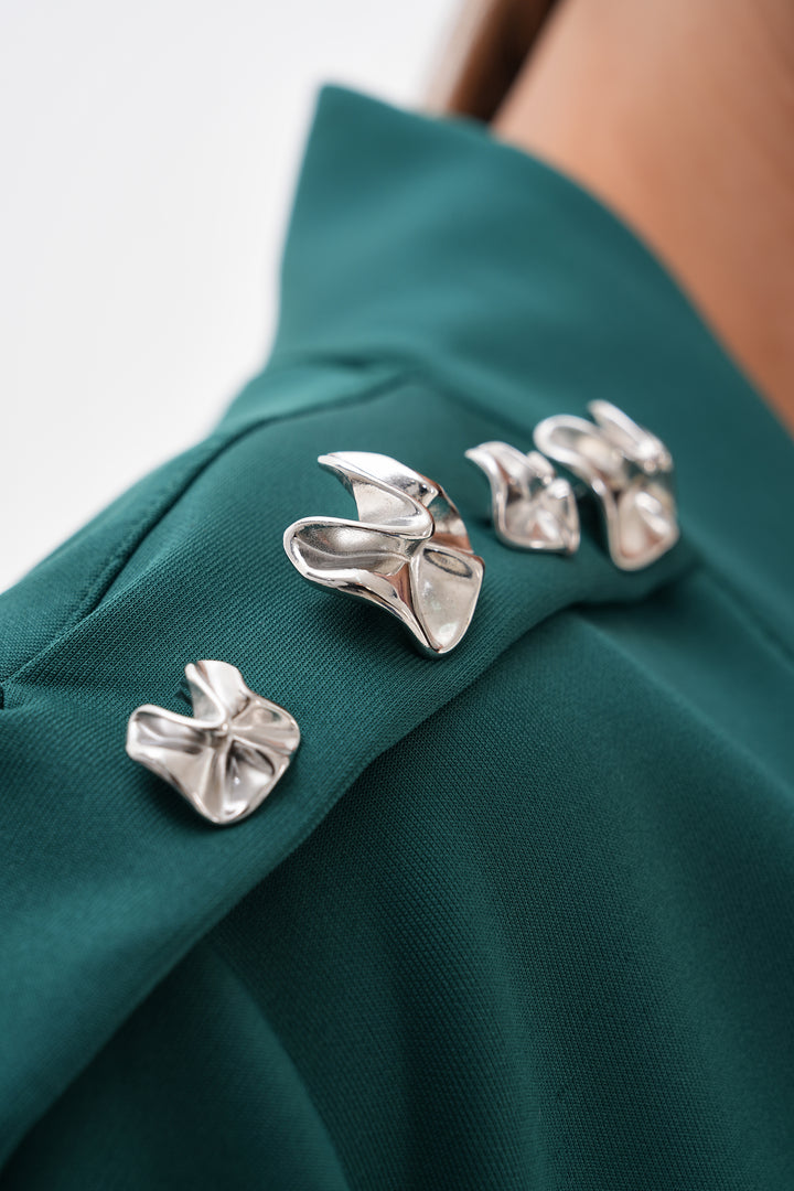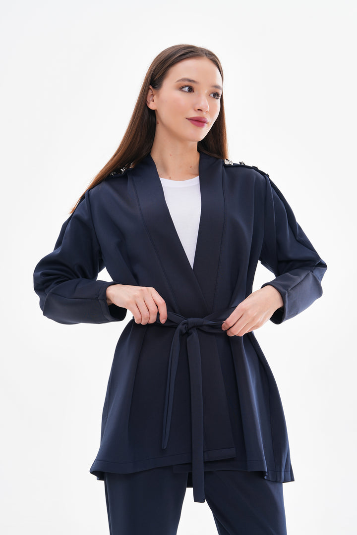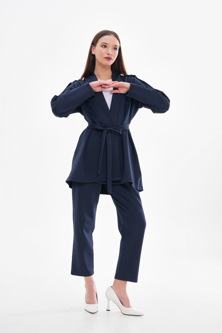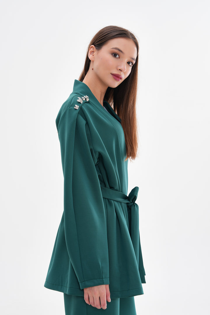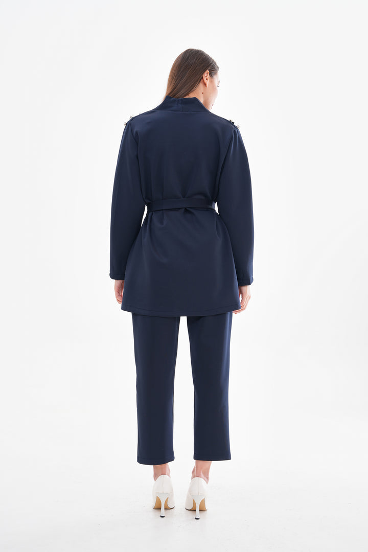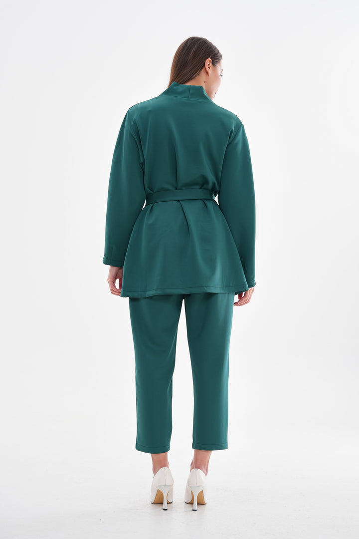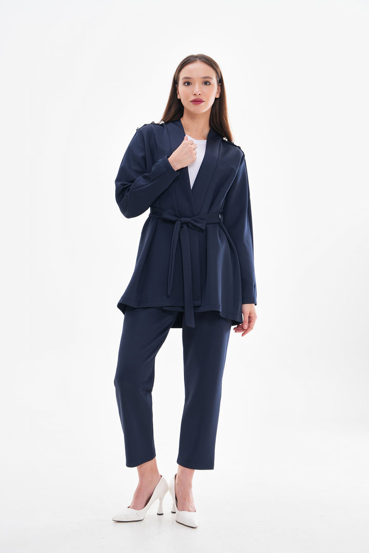طقم أنيق من قطعتين يتكوّن من توب واسع بحزام يحدد الخصر وتزيين لامع على الأكتاف، مع بنطال متناسق بقصة مستقيمة. مصنوع من قماش ناعم وخفيف يمنحك الراحة والأناقة. خيار مثالي لإطلالة محتشمة بلمسة عصرية أنيقة.