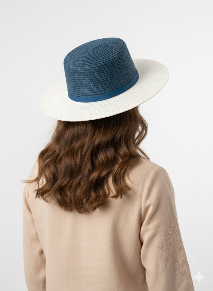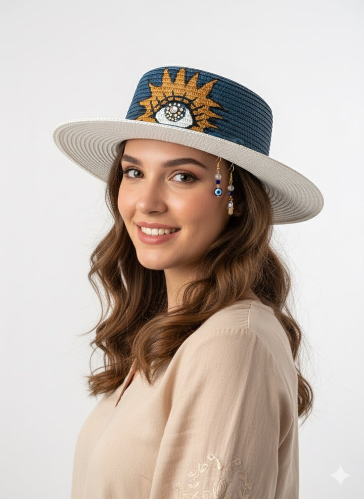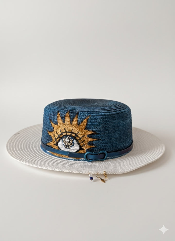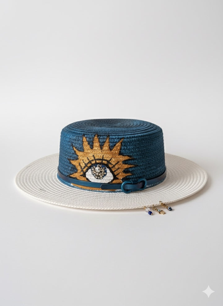 قبعة قش فريدة مرسومة يدويًا بتصميم عين شمس جذاب يرمز إلى الحماية والرؤية الثاقبة. التاج مظلل ببراعة باللون الأزرق الداكن مع أشعة ذهبية تحيط بنقش عين متقن، ومزين بخرز رقيق لإضفاء لمسة من التألق. مزينة بإكسسوارات جانبية أنيقة تضفي لمسة من السحر والتميز، تجمع هذه القبعة ببراعة بين الفن والحرفية - قطعة مميزة لأي يوم مشمس.