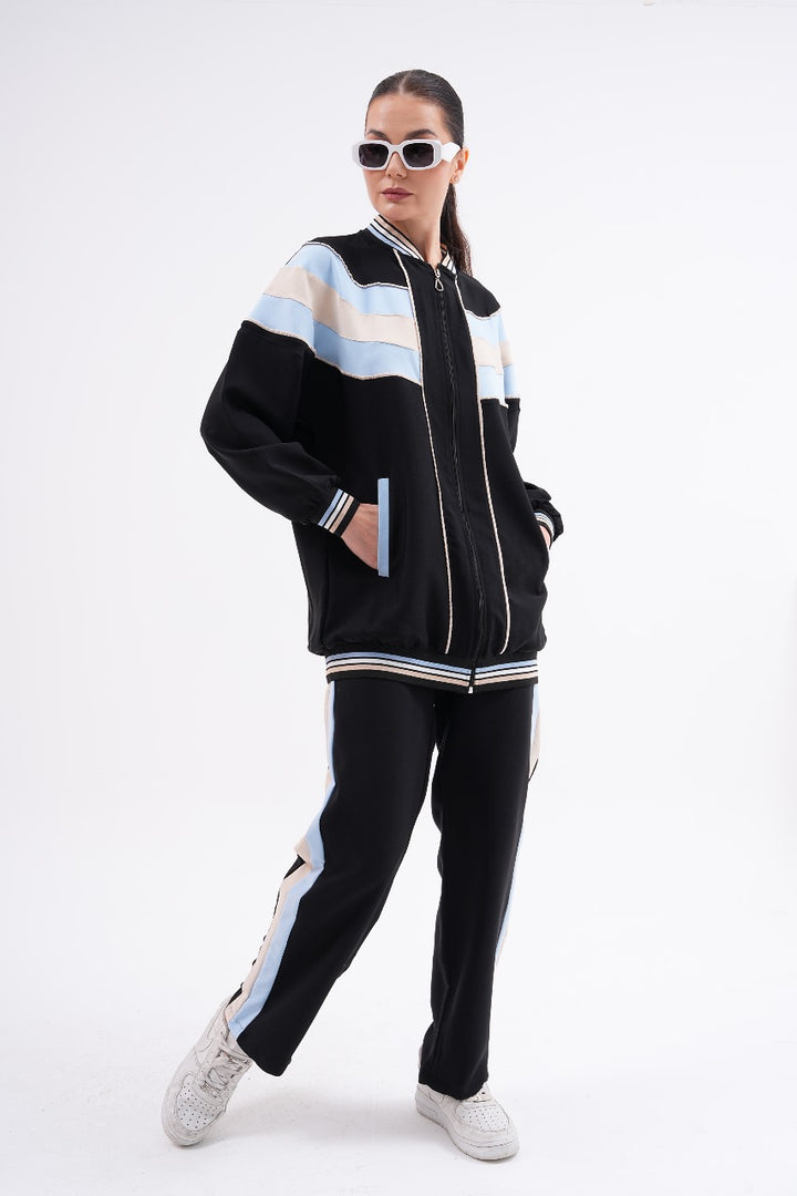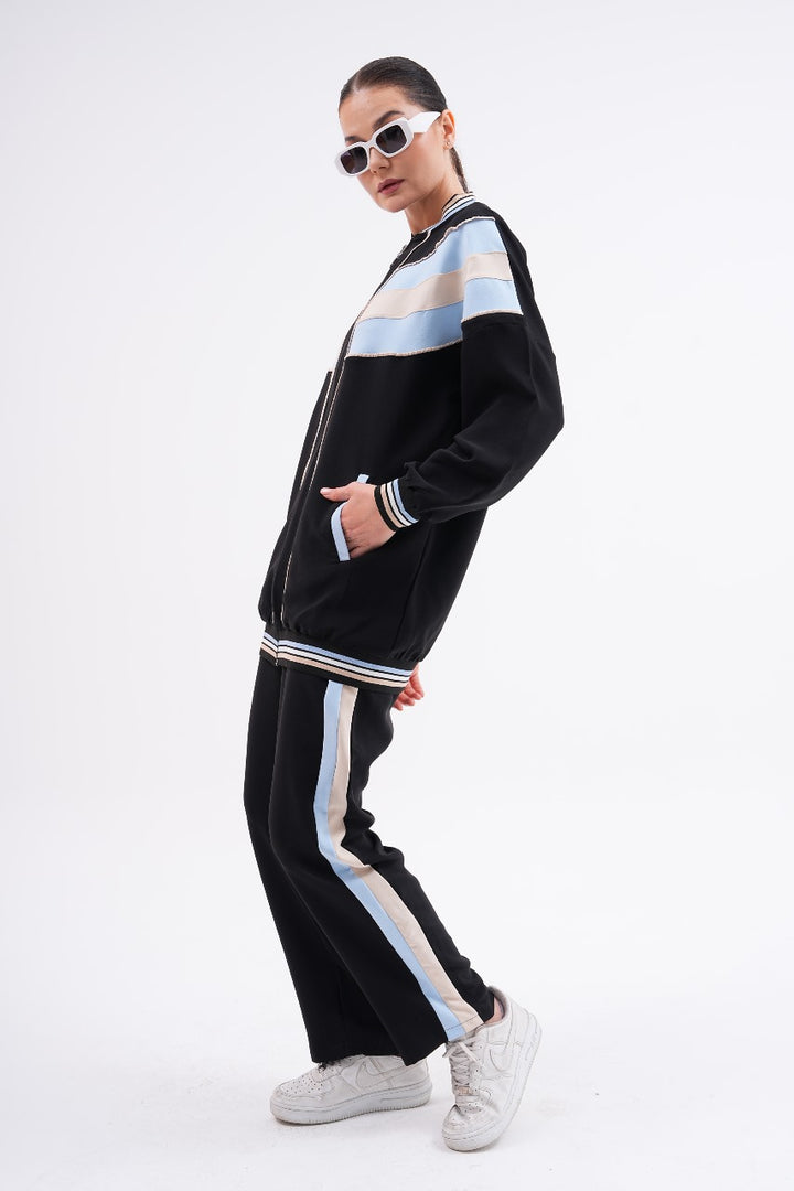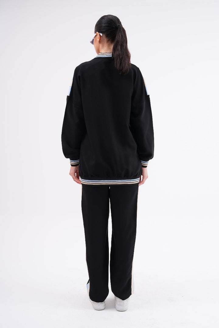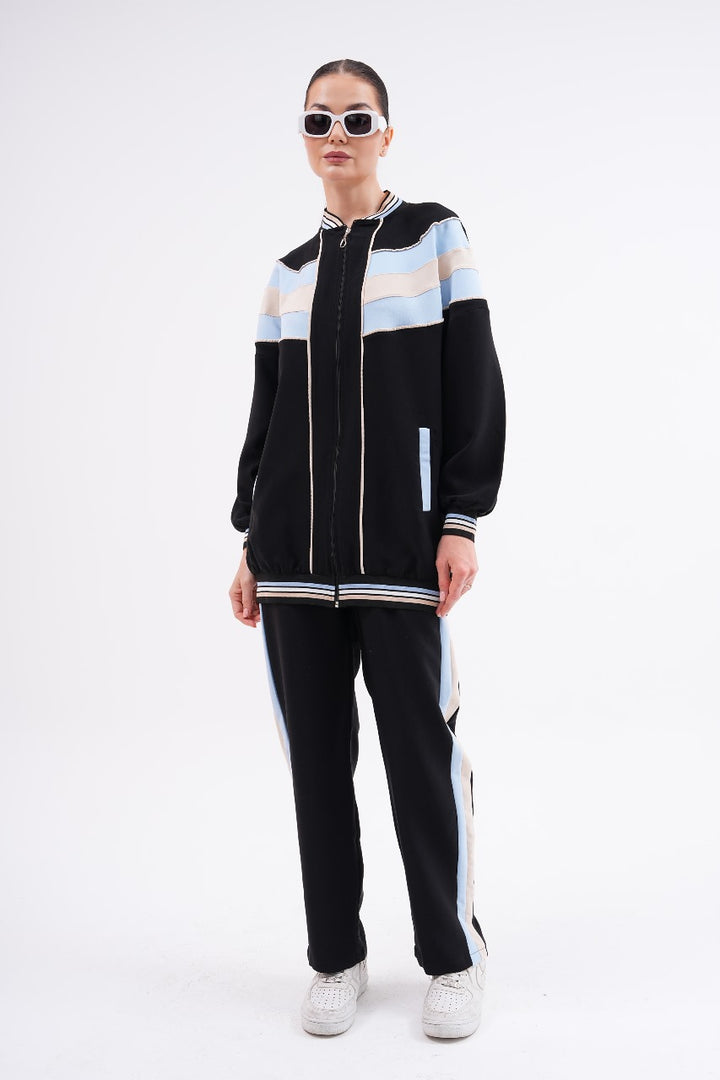 ارتقي بإطلالتك الكاجوال مع هذا الطقم الرياضي الأسود، المصمم بنمط ألوان متناسقة وعصرية. مصنوع من قماش مريح وخفيف مثالي للأيام النشيطة أو الإطلالات اليومية المريحة. مظهر عصري مع أقصى درجات الراحة!