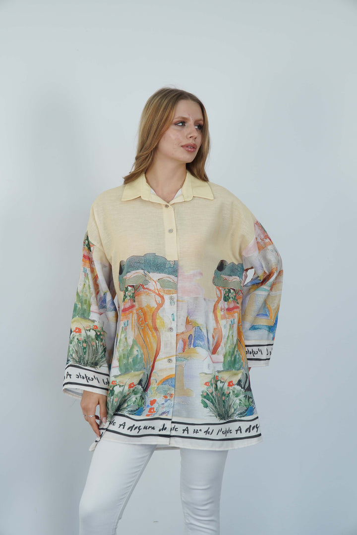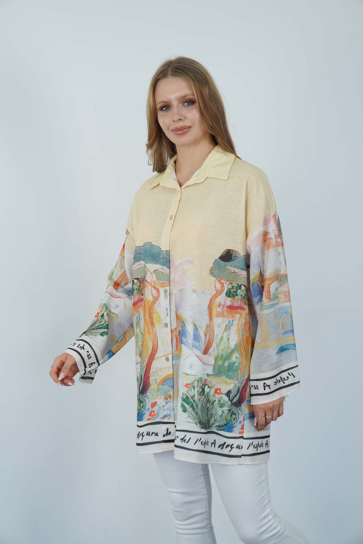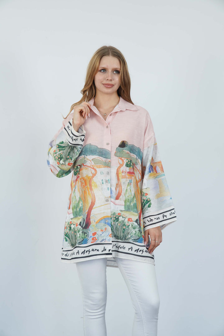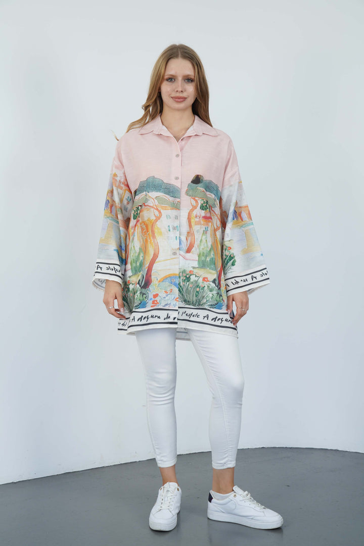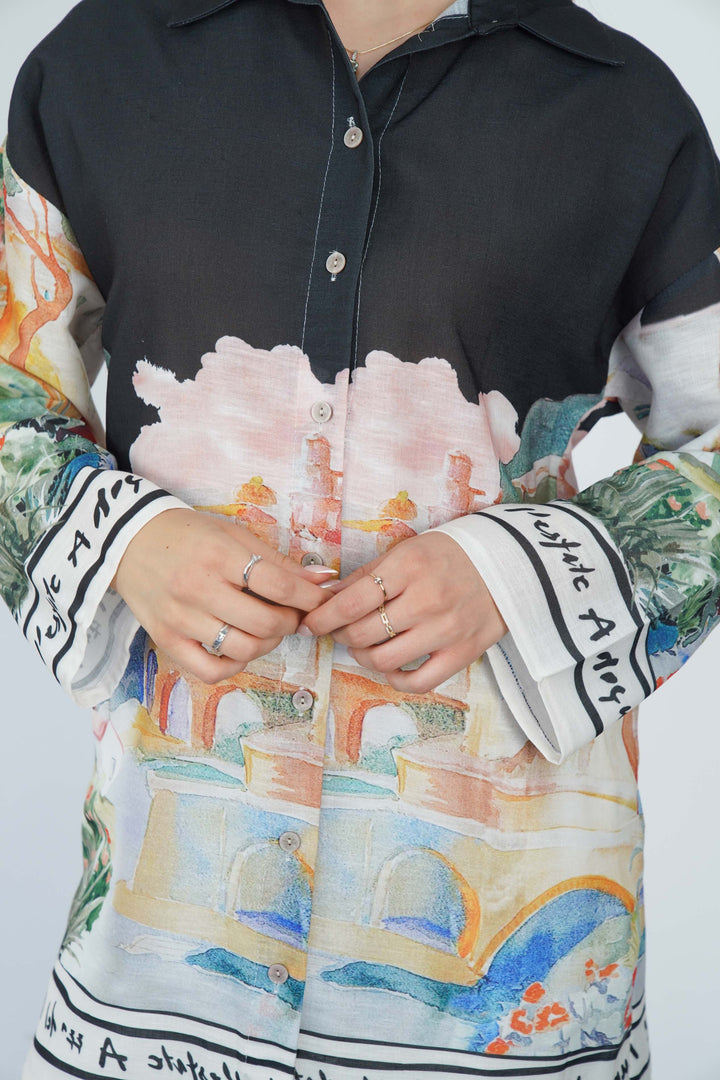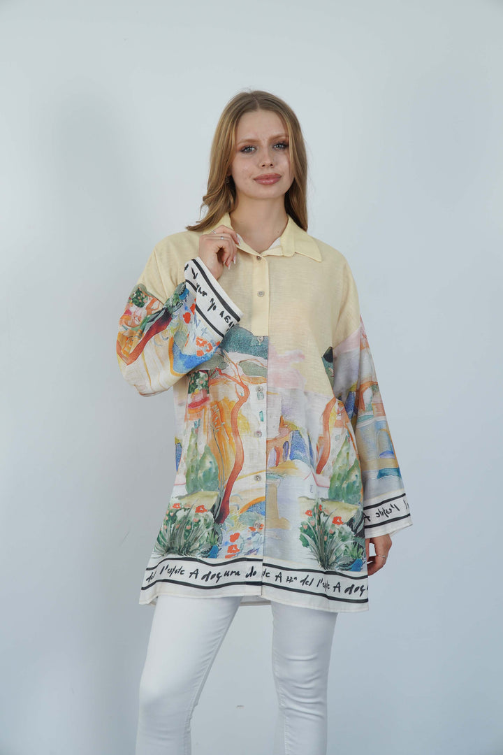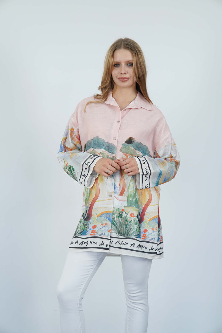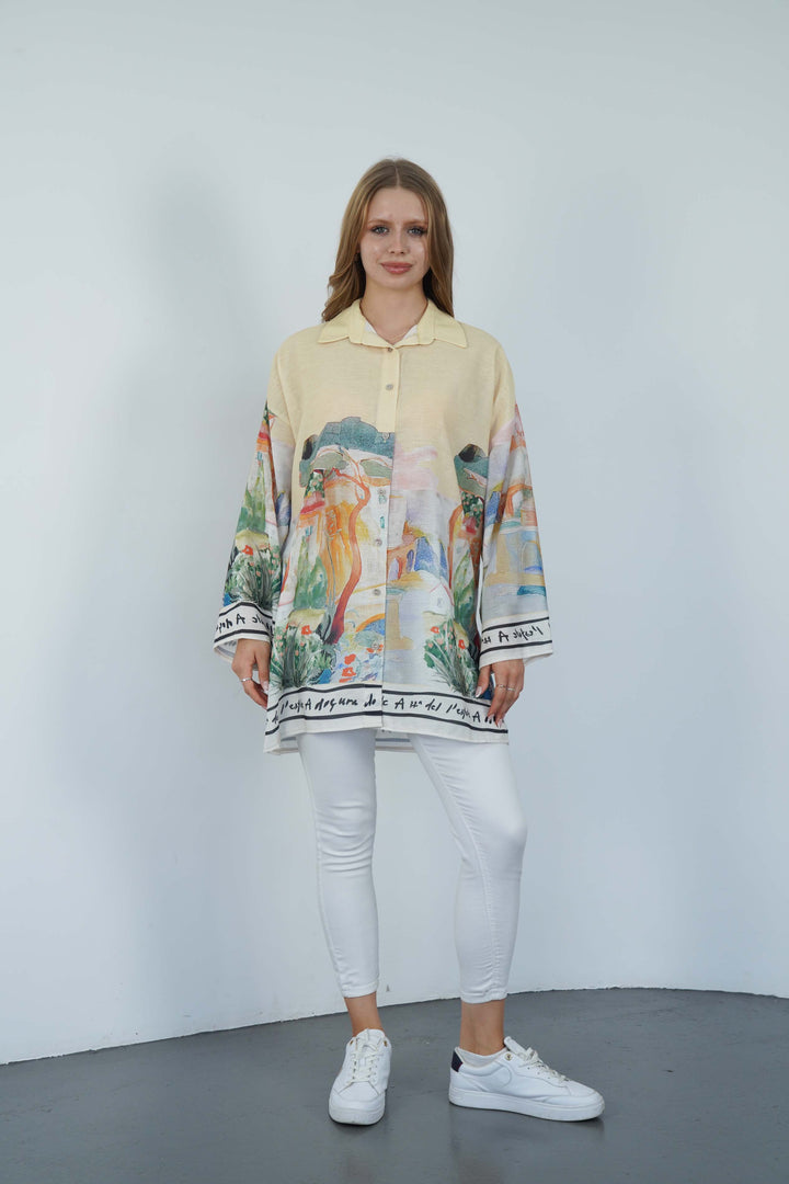 A stylish and unique shirt featuring elegant artistic prints across the front for a sophisticated and creative look. Designed with a classic collar and button-down front, it’s perfect for casual or semi-formal outfits. Available in three beautiful colors to suit your style.