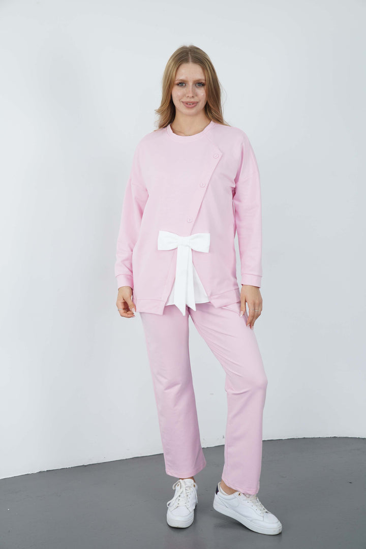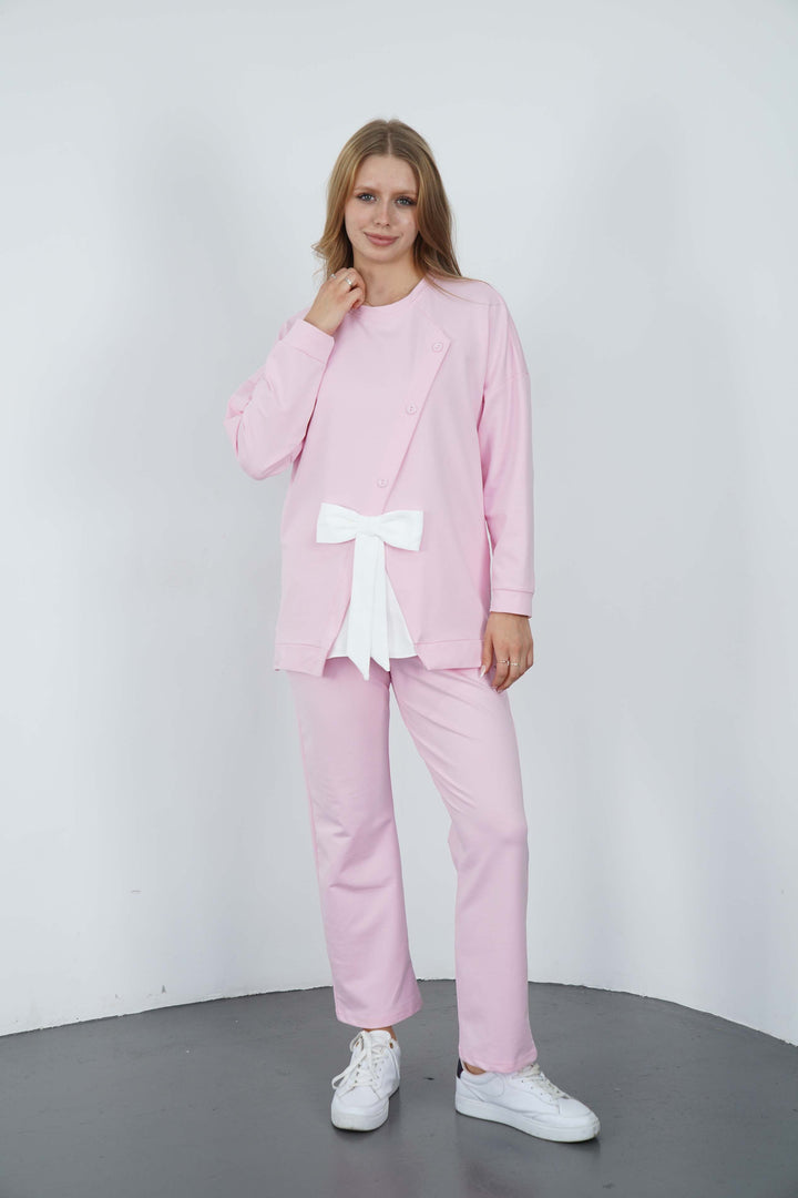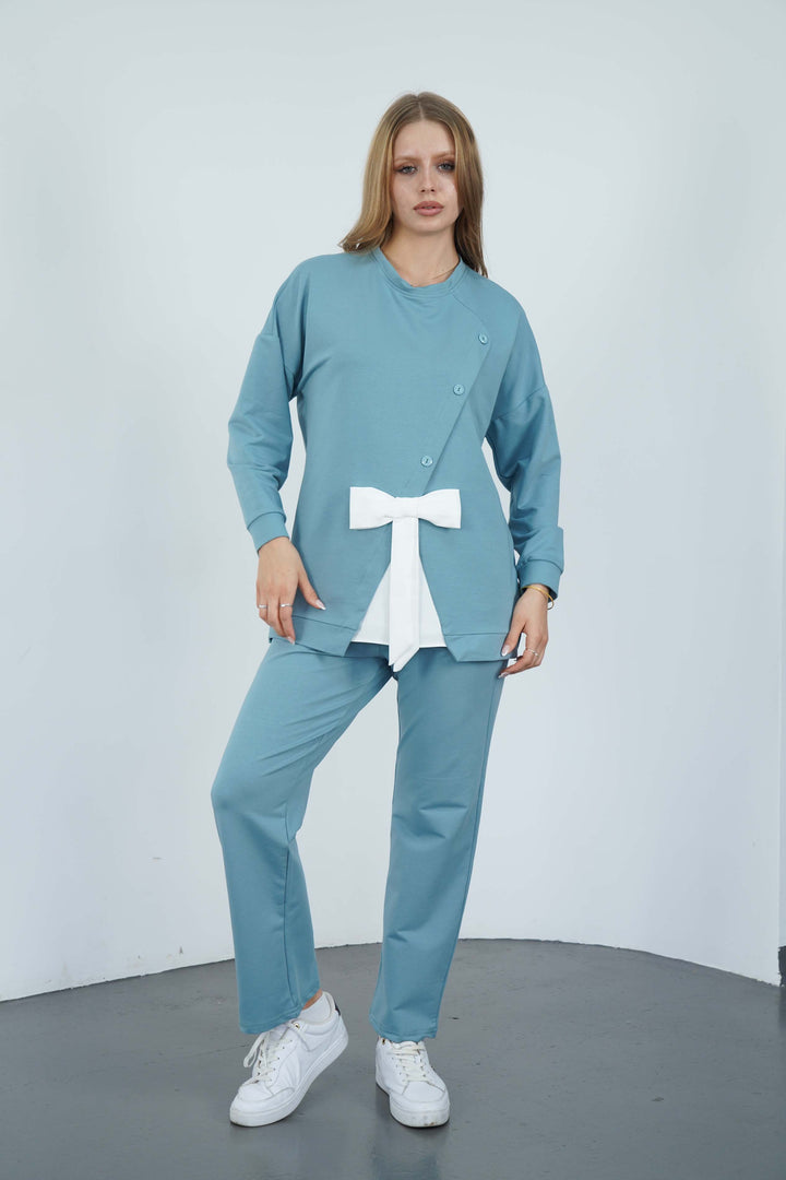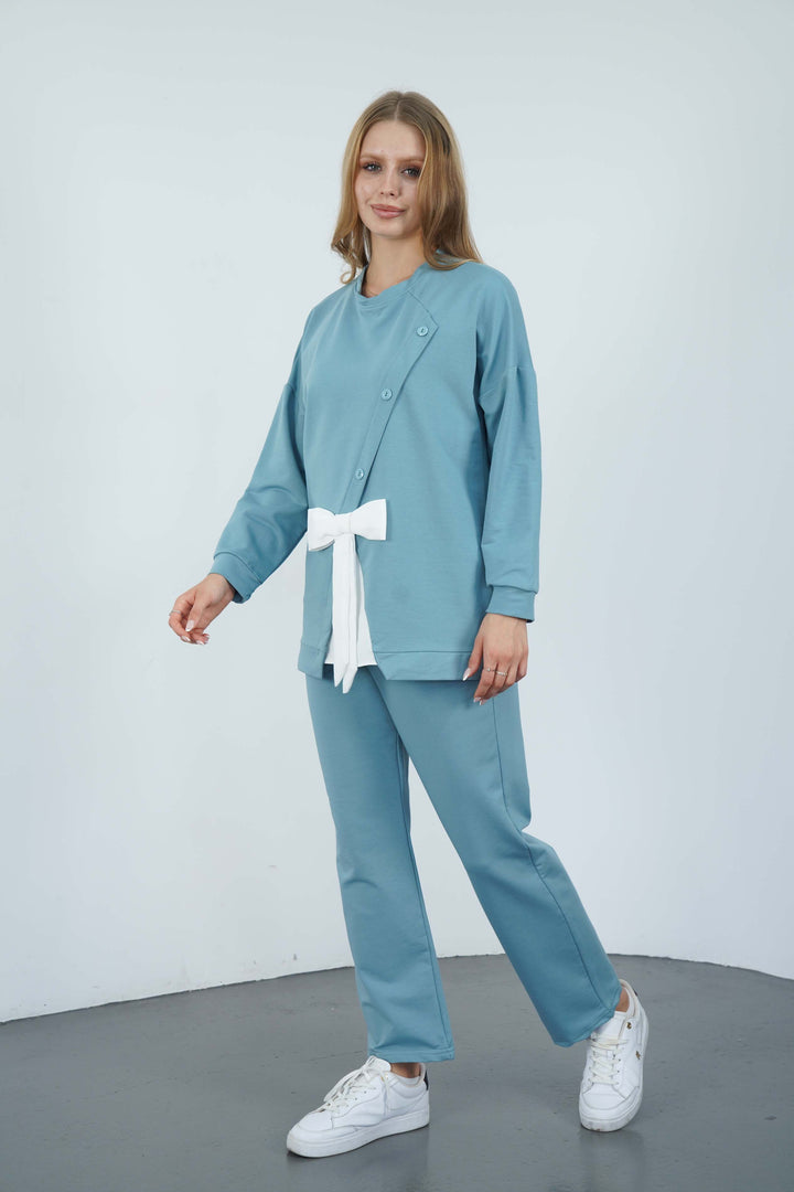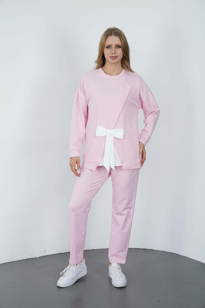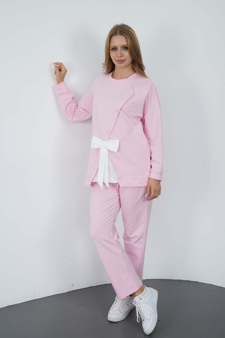 Elevate your casual look with this chic training suit, designed for both comfort and style. The top features a unique diagonal button detail on the chest and a stylish white bow on the side, adding a playful and elegant touch. Paired with matching elastic-waist pants, this set is perfect for lounging, light workouts, or everyday wear. Available in a variety of trendy colors to match your vibe.