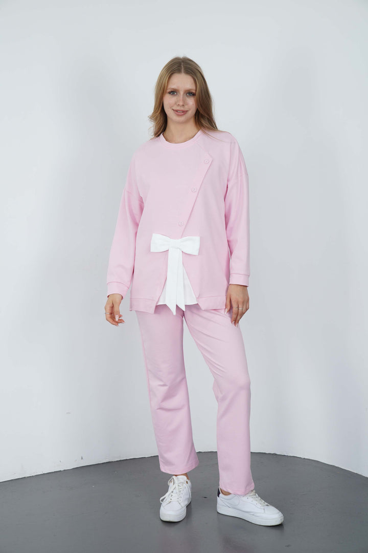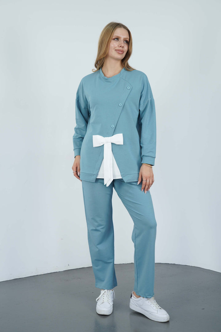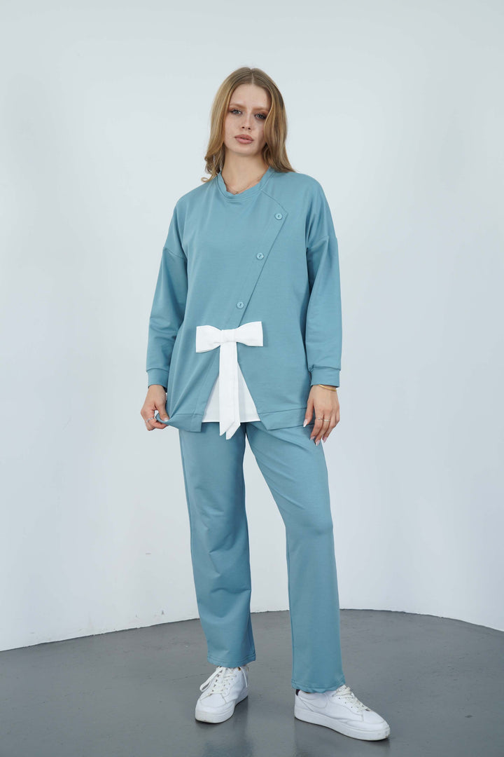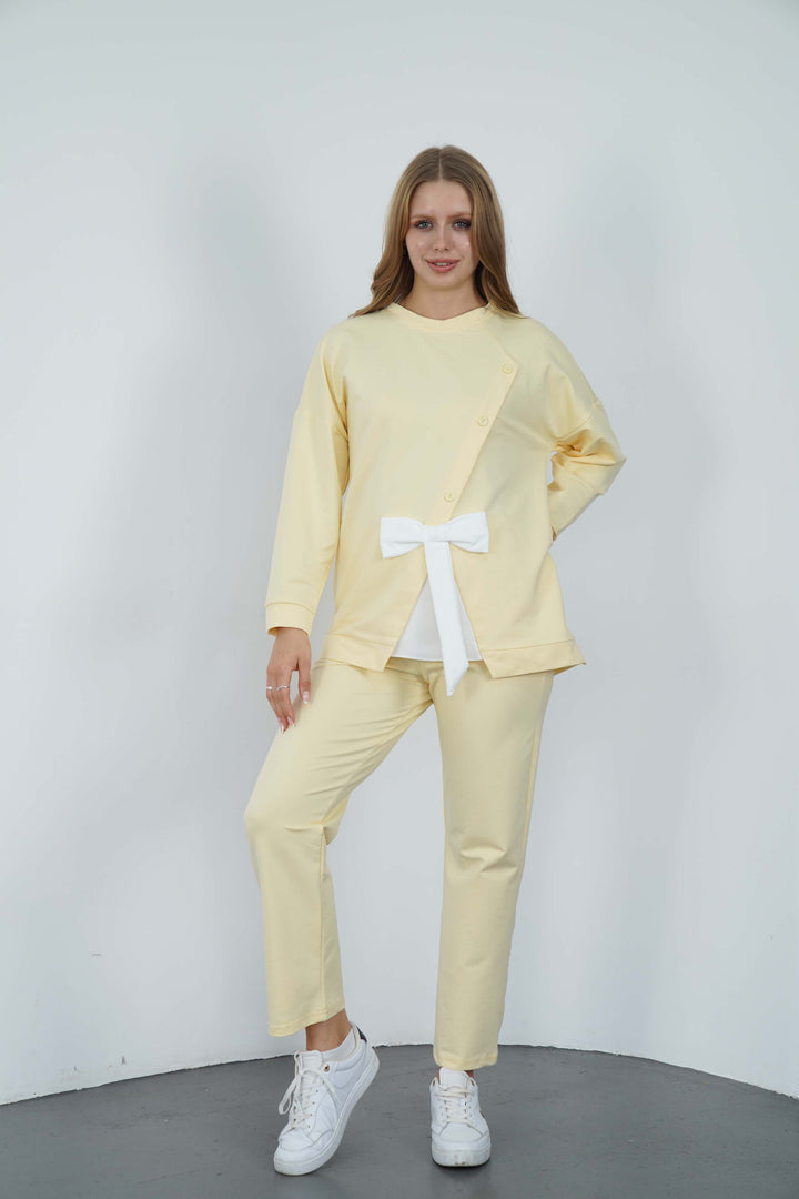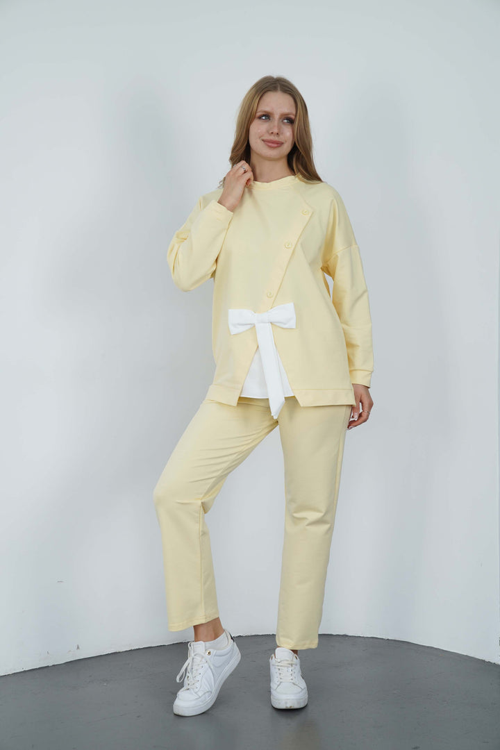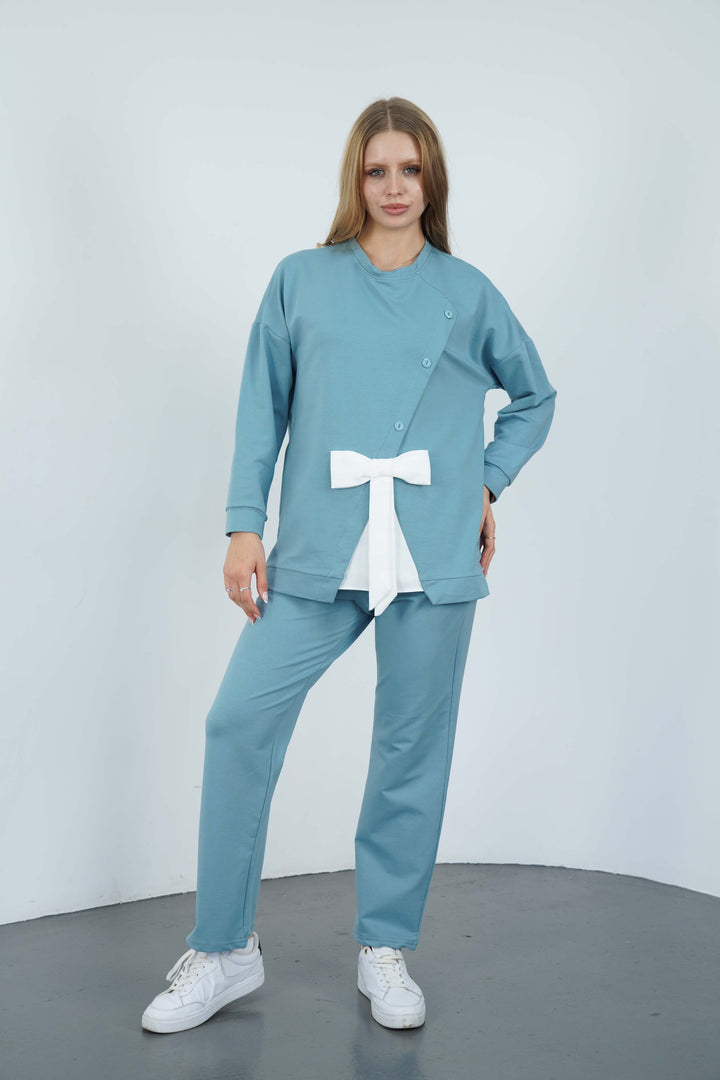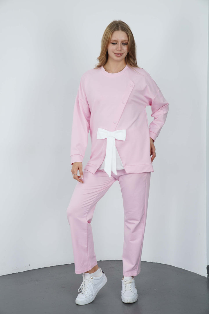 Elevate your casual look with this chic training suit, designed for both comfort and style. The top features a unique diagonal button detail on the chest and a stylish white bow on the side, adding a playful and elegant touch. Paired with matching elastic-waist pants, this set is perfect for lounging, light workouts, or everyday wear. Available in a variety of trendy colors to match your vibe.
