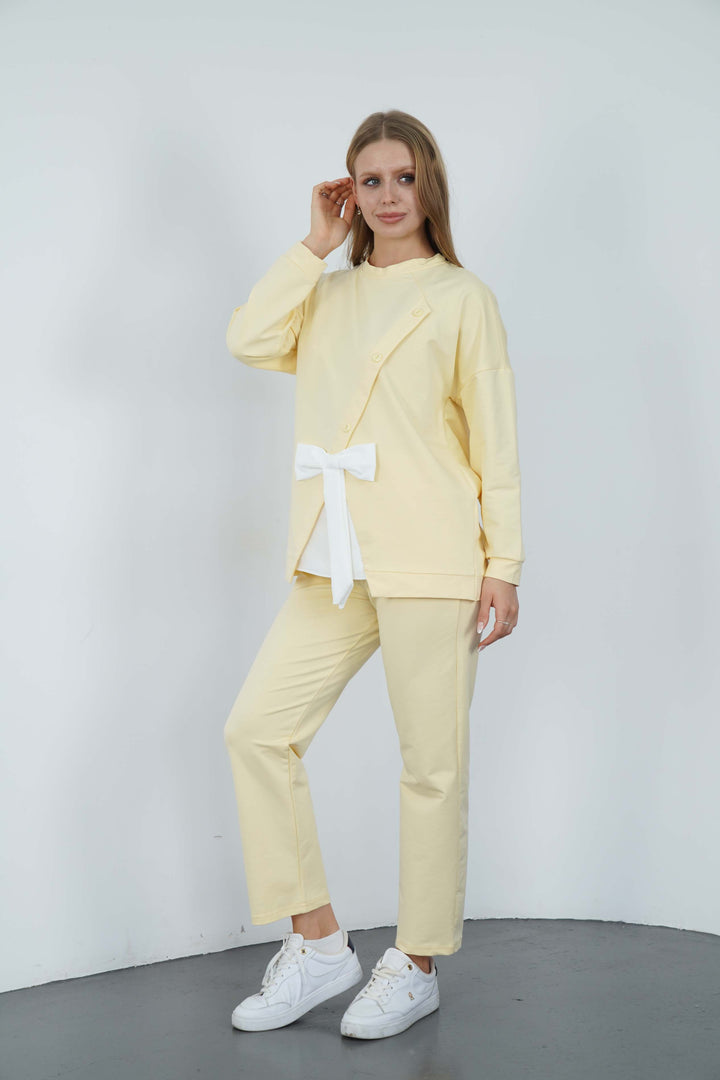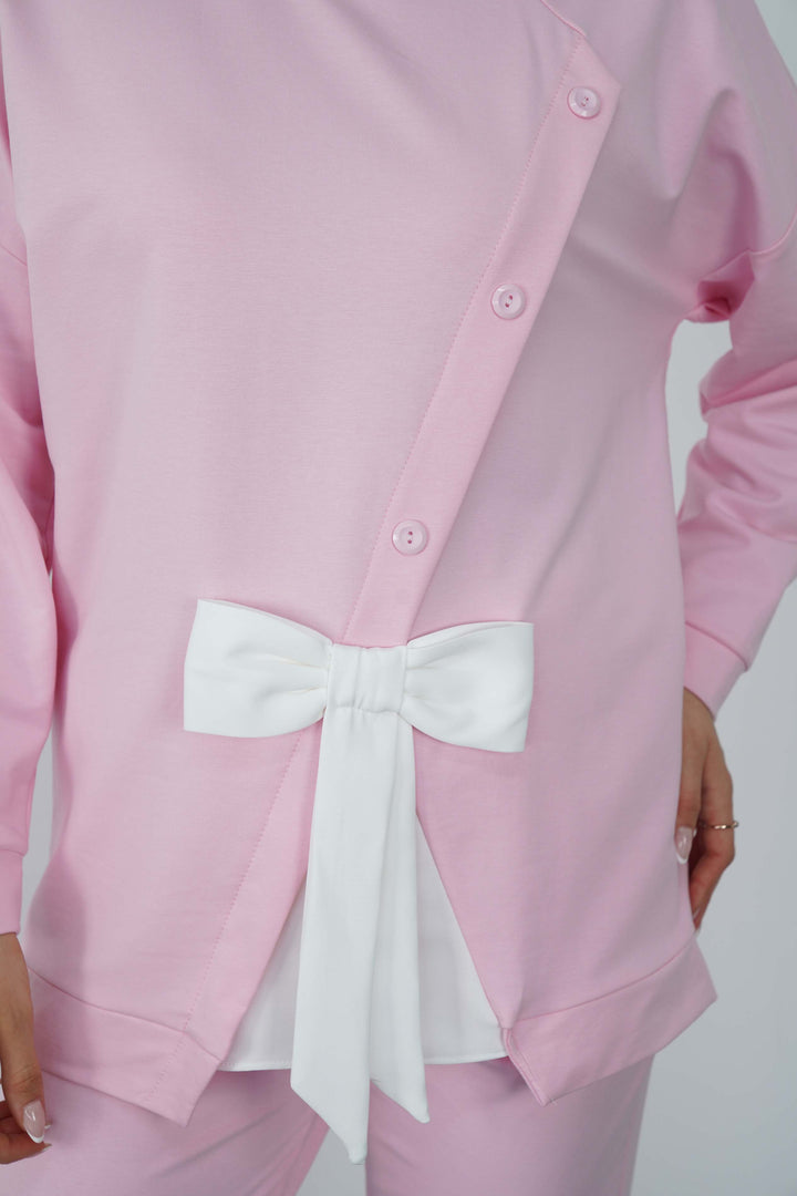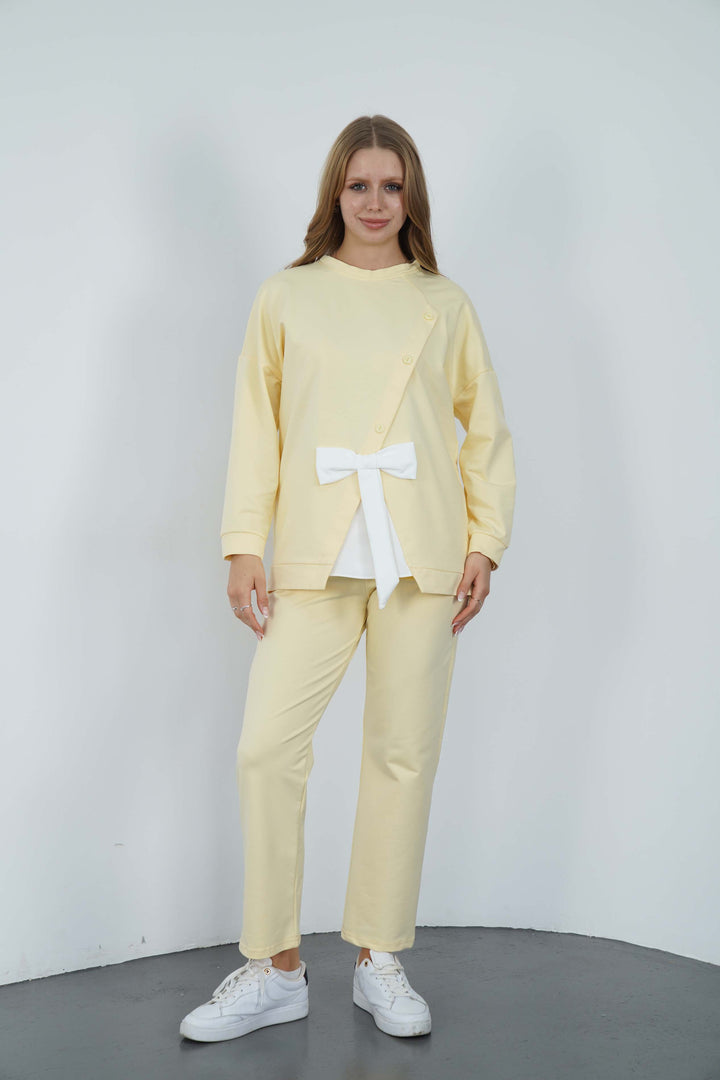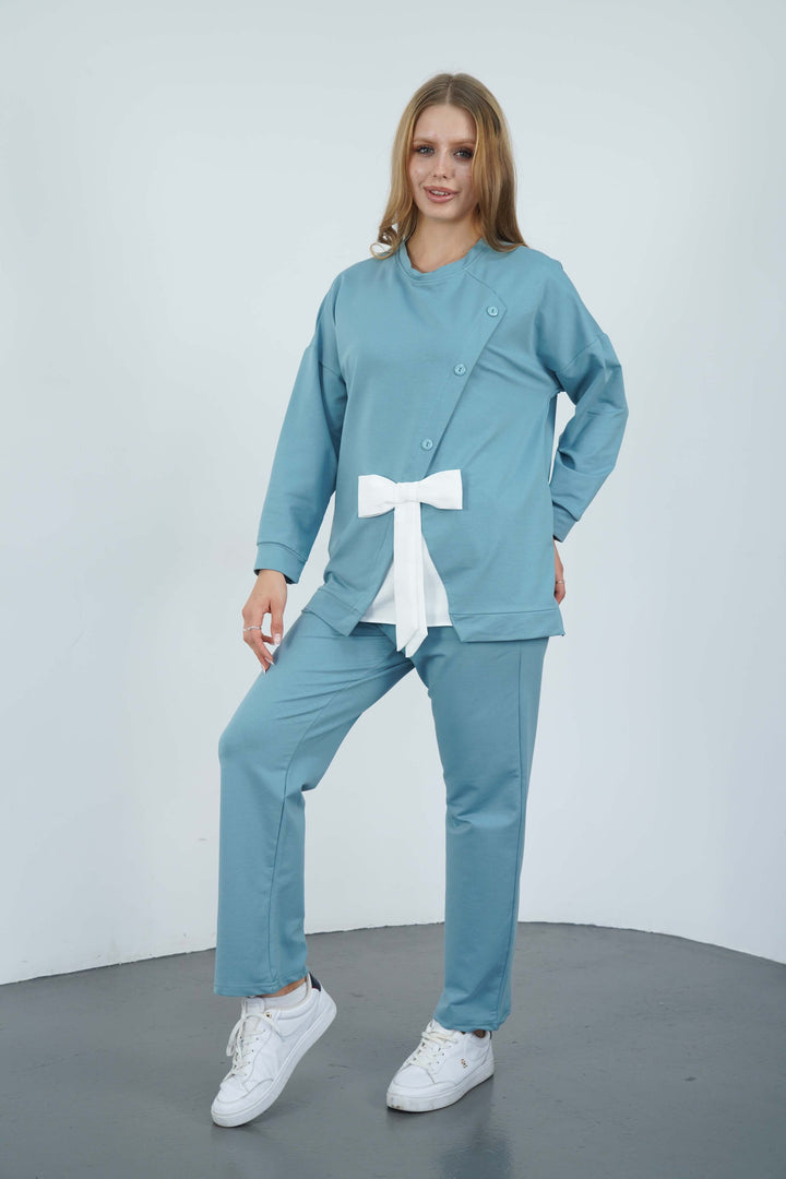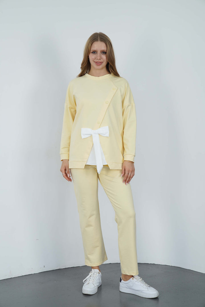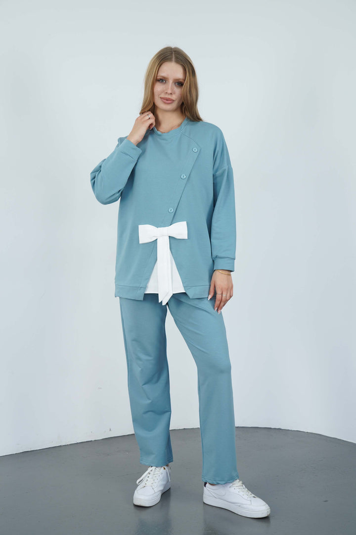 Elevate your casual look with this chic training suit, designed for both comfort and style. The top features a unique diagonal button detail on the chest and a stylish white bow on the side, adding a playful and elegant touch. Paired with matching elastic-waist pants, this set is perfect for lounging, light workouts, or everyday wear. Available in a variety of trendy colors to match your vibe.