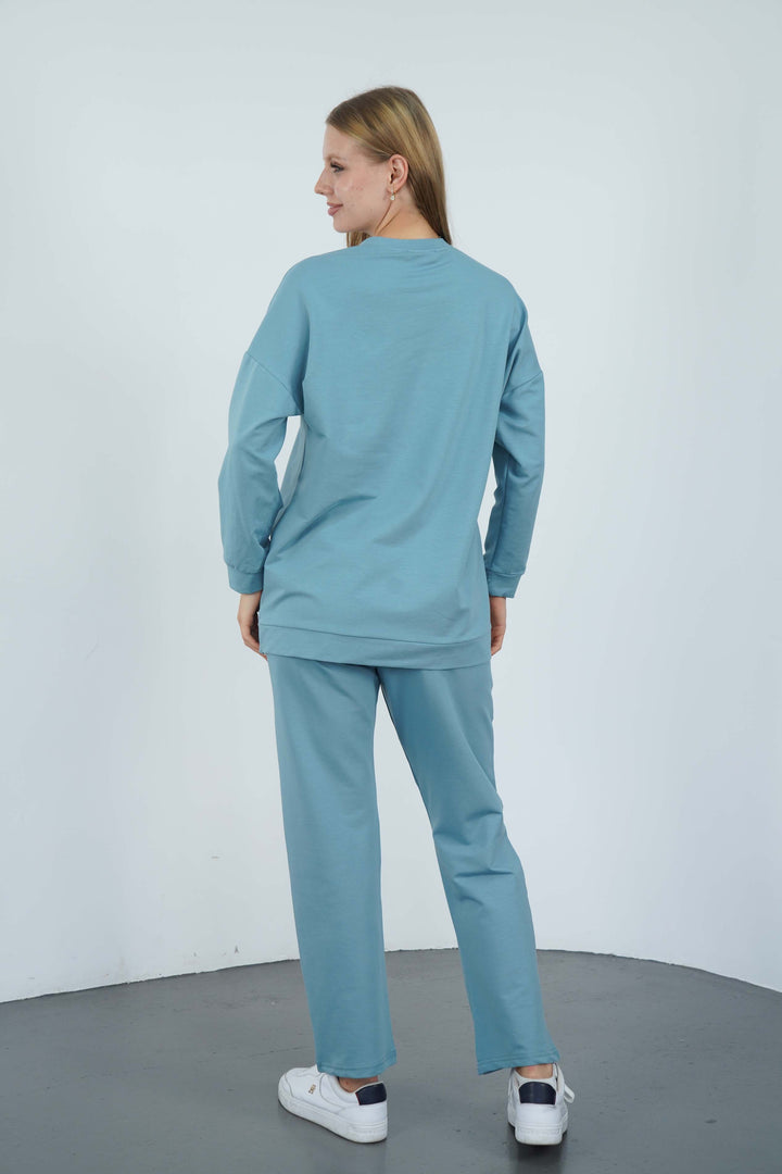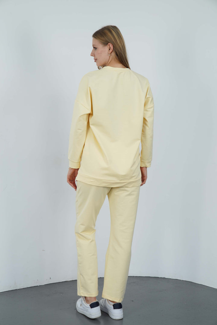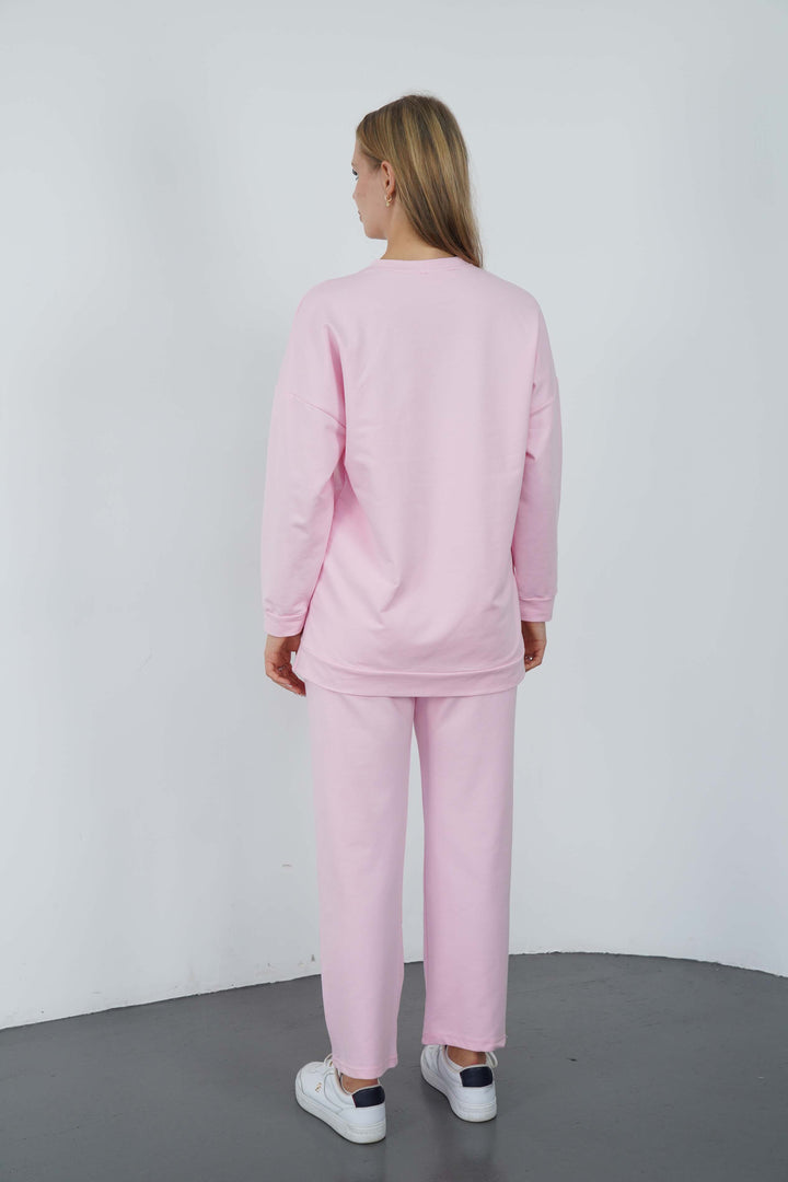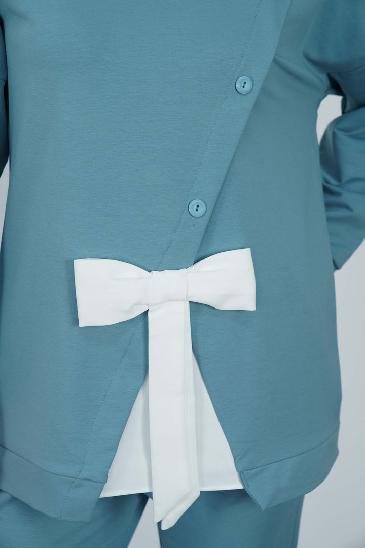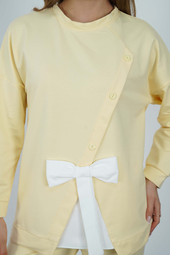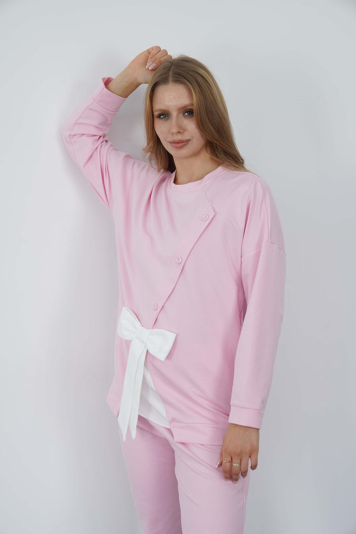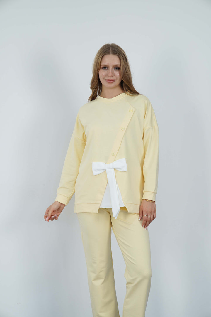 Elevate your casual look with this chic training suit, designed for both comfort and style. The top features a unique diagonal button detail on the chest and a stylish white bow on the side, adding a playful and elegant touch. Paired with matching elastic-waist pants, this set is perfect for lounging, light workouts, or everyday wear. Available in a variety of trendy colors to match your vibe.