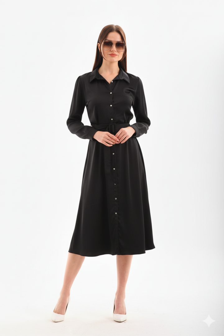 A timeless shirt dress crafted from smooth, silky fabric that feels soft against the skin. Designed with a button-down front, collar, and matching waist belt for a flattering silhouette. Perfect for both daytime outings and casual evenings.