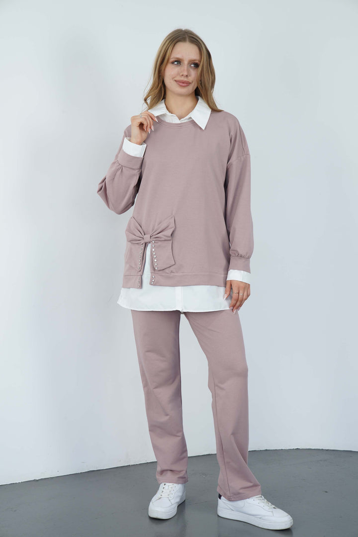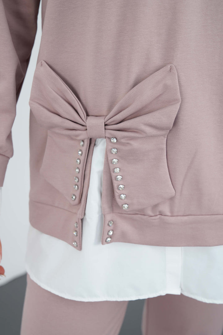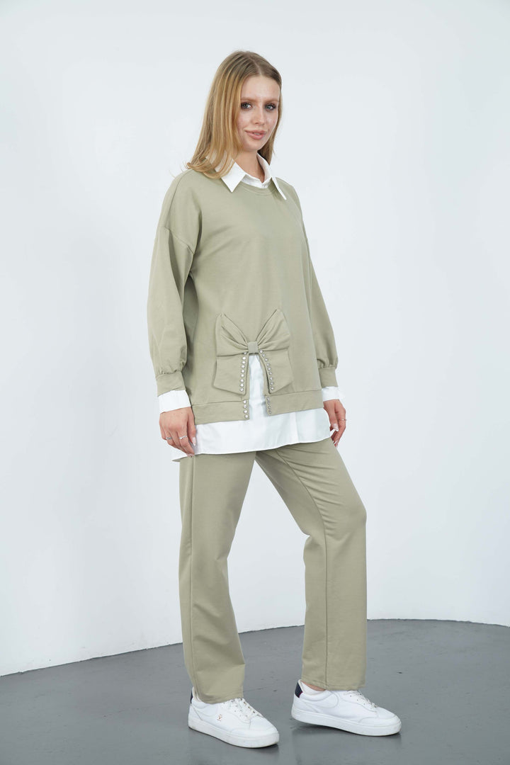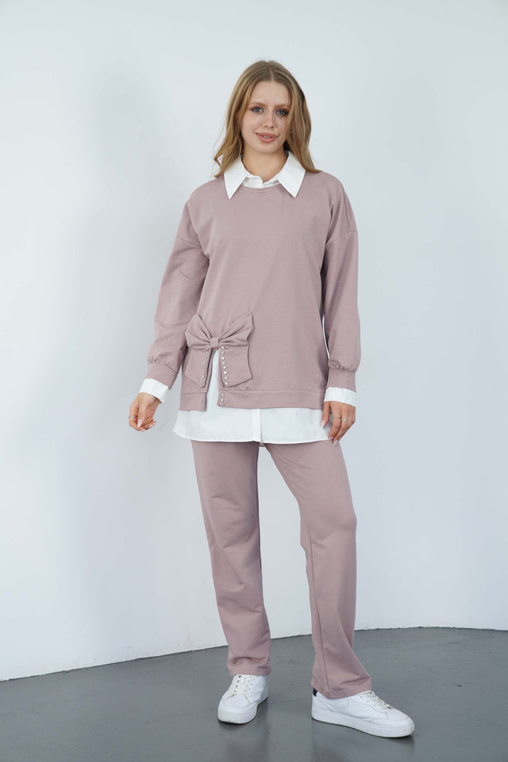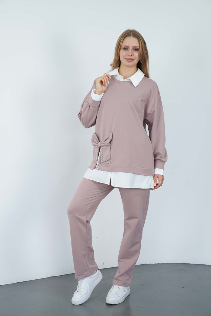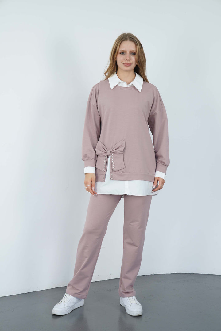 A stylish and comfortable bow training suit designed for both elegance and ease. Features a long top with a cute side bow detail and matching pants for a coordinated look. Available in three chic colors, made from soft, breathable fabric that ensures comfort and freedom of movement all day long.