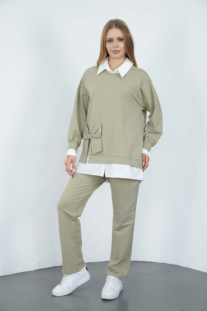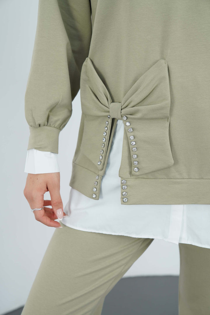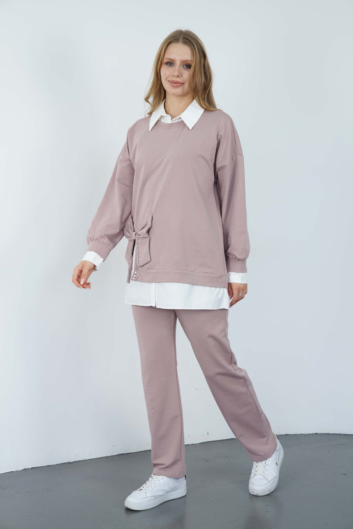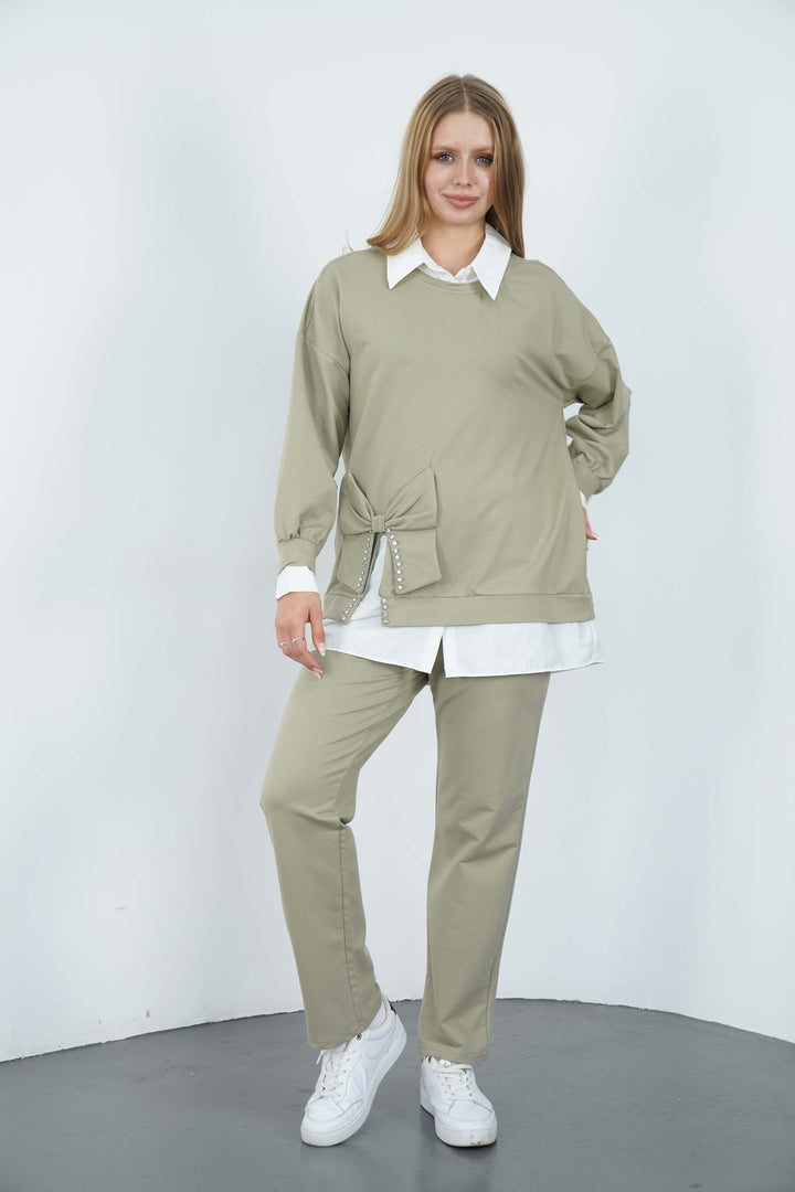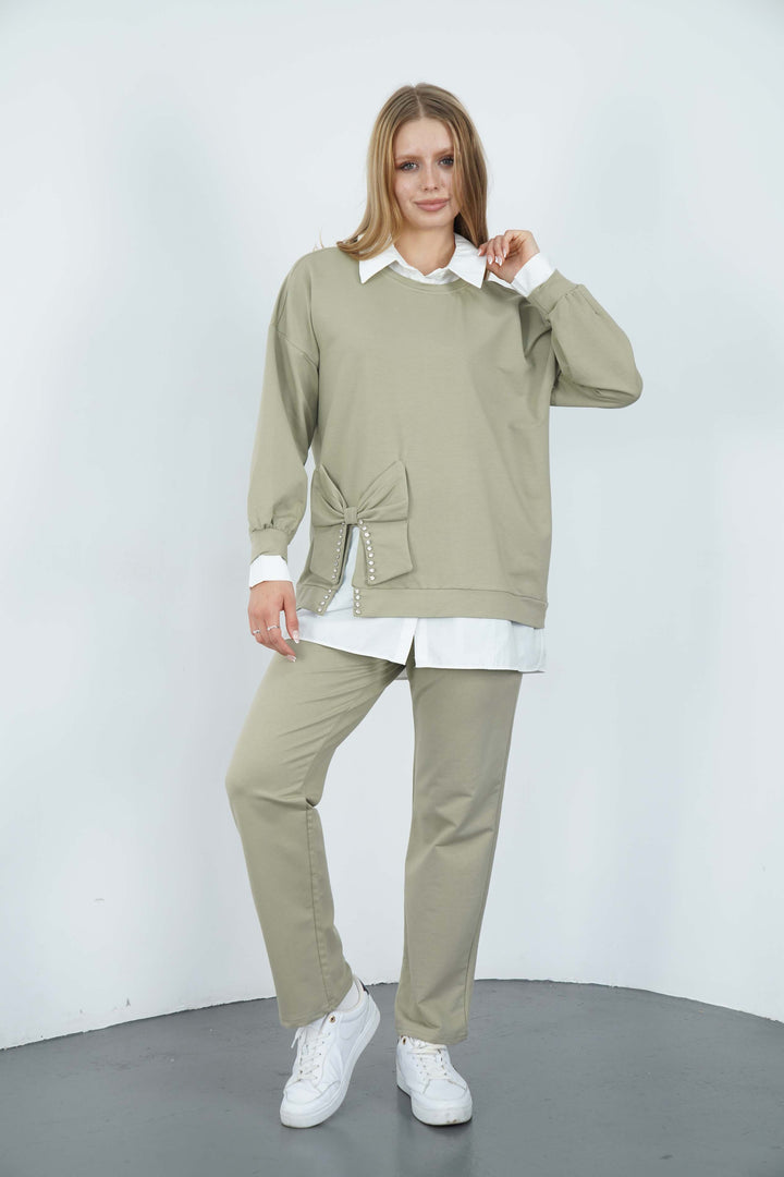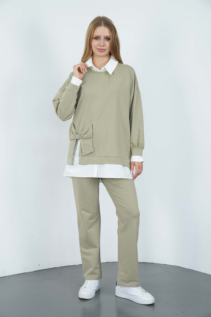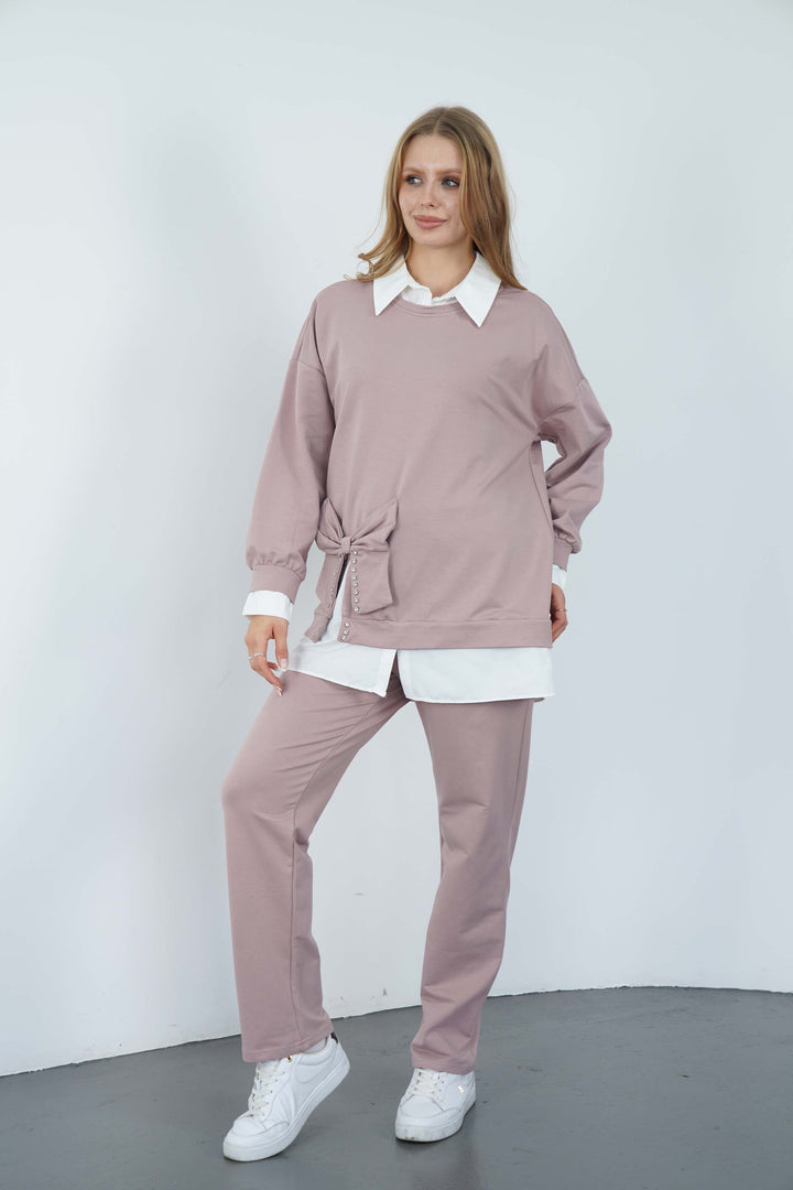 A stylish and comfortable bow training suit designed for both elegance and ease. Features a long top with a cute side bow detail and matching pants for a coordinated look. Available in three chic colors, made from soft, breathable fabric that ensures comfort and freedom of movement all day long.