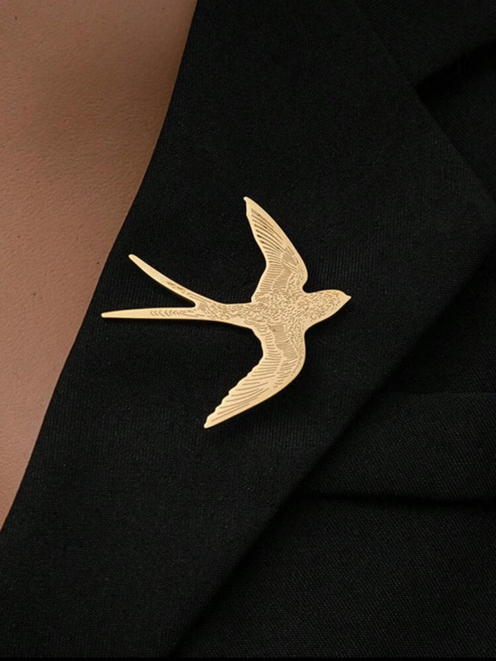 brooch is shaped like a flying bird, featuring a simple yet elegant design. It is made in a golden color with intricate details on the wings and tail feathers, adding an artistic and refined touch. The brooch is pinned on a black fabric, which makes the gold color stand out beautifully and stylishly. The design symbolizes freedom and flight, making it a perfect accessory for both formal and casual wear to add a unique and attractive flair.