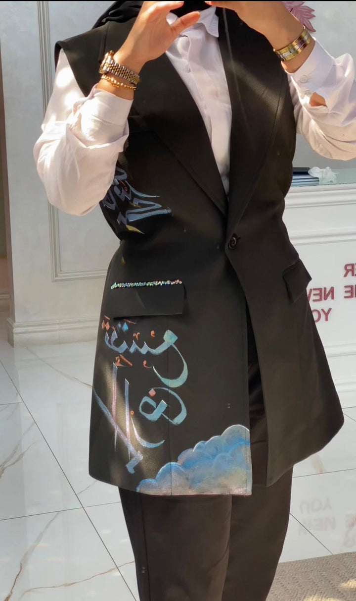 Make a bold and artistic statement with this elegant hand-painted fabric vest. Designed with intricate Arabic calligraphy, each stroke is meticulously painted by hand, turning the garment into a wearable piece of art. Crafted from premium fabric with a sleek, tailored fit, this vest blends cultural expression with modern sophistication. Subtle embellishments add a touch of sparkle, making it perfect for both formal and creative occasions. A true fusion of art, fashion, and identity.