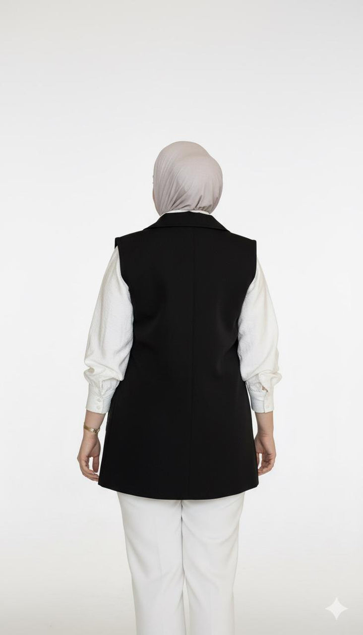 A stylish black vest featuring hand-painted Arabic lettering in elegant blue tones. The artistic calligraphy adds a unique handcrafted touch, blending cultural expression with modern, effortless style. Perfect for creating a refined and expressive look.