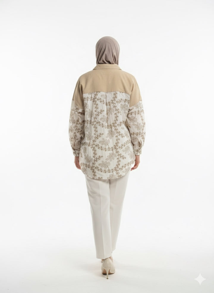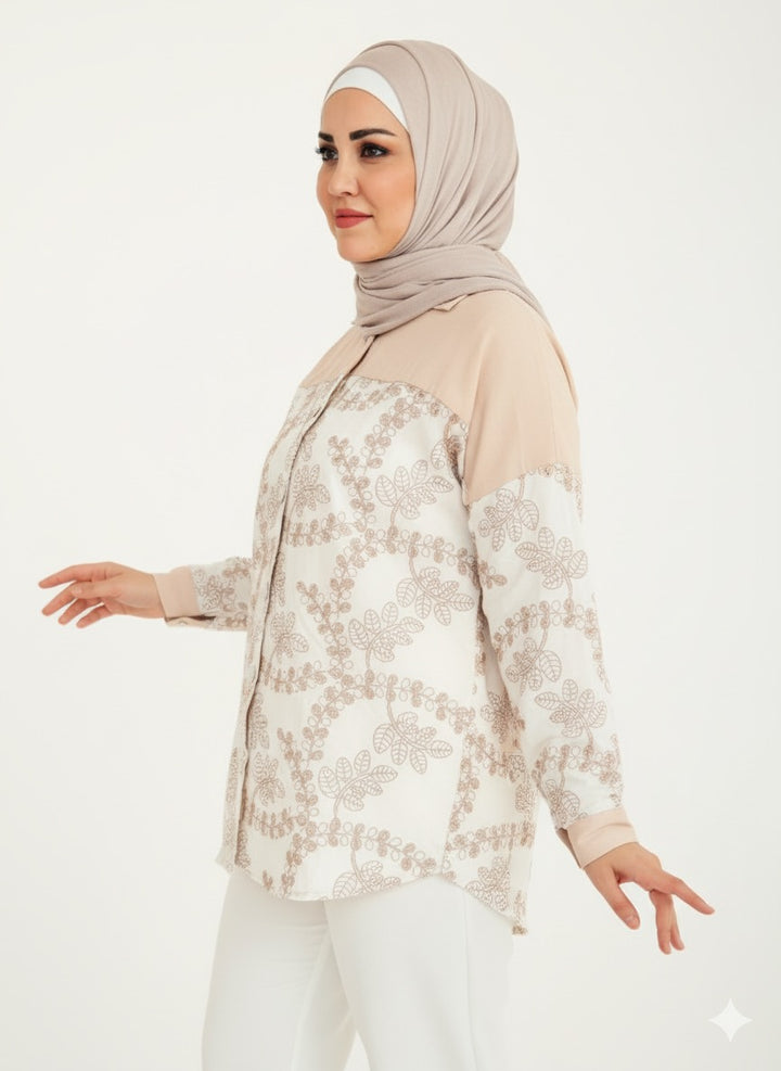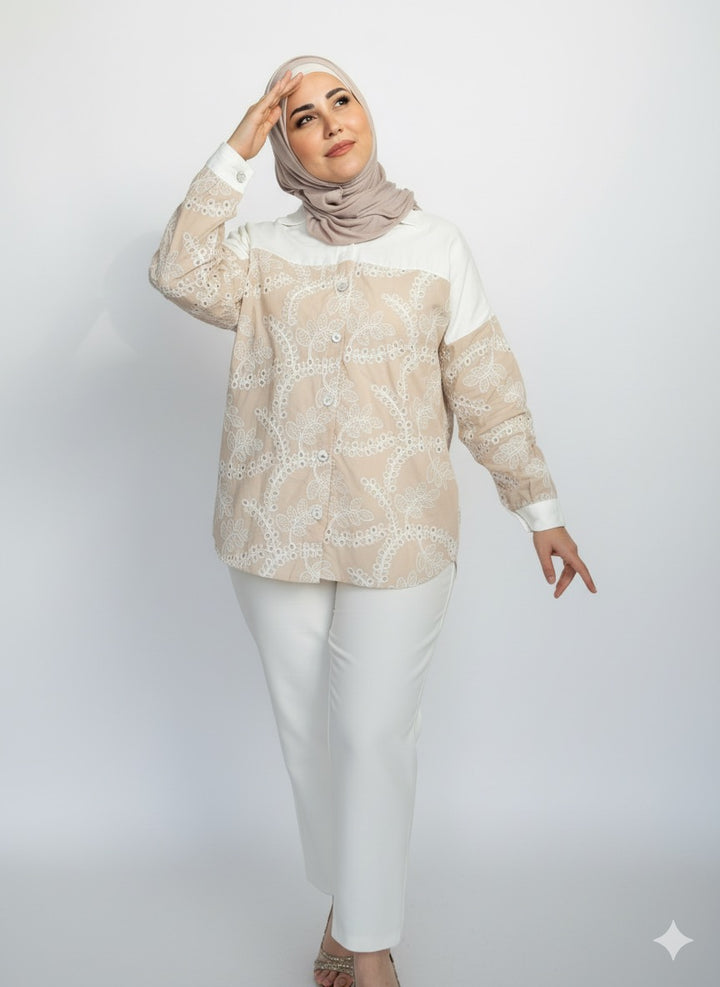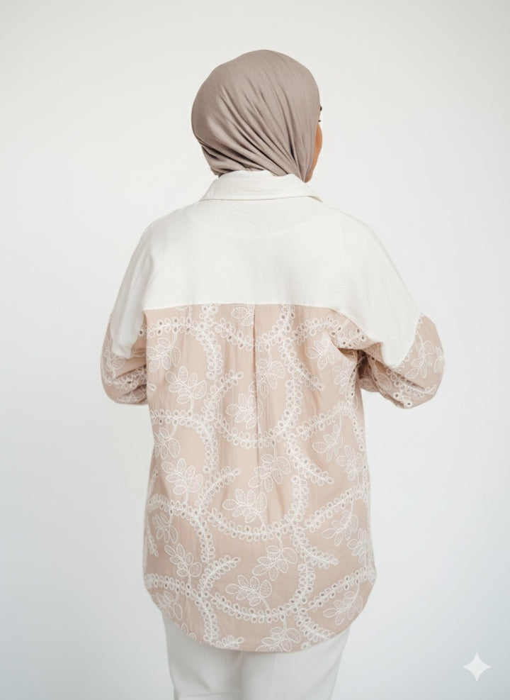 A refined button-down shirt blending crisp white with warm beige, adorned with intricate white leaf embroidery for an airy, feminine touch. The mix of solid fabric and delicate cutwork detailing creates a look that’s both elegant and effortlessly relaxed—perfect for elevating casual days or softening tailored outfits.