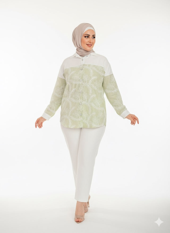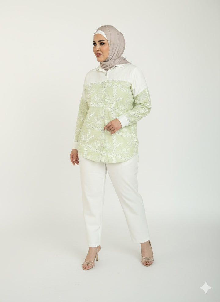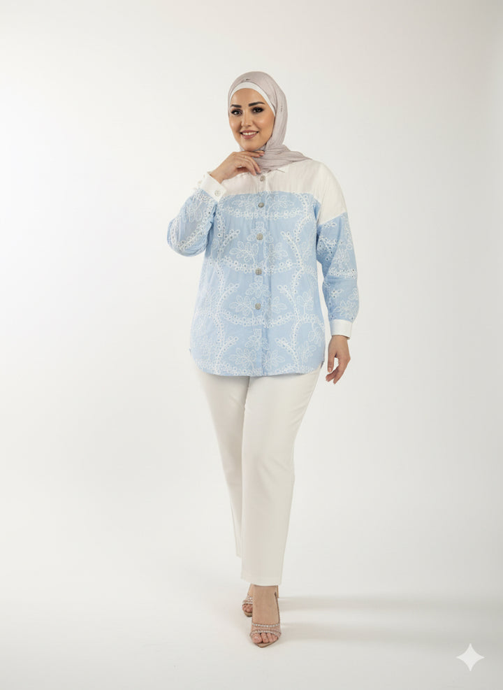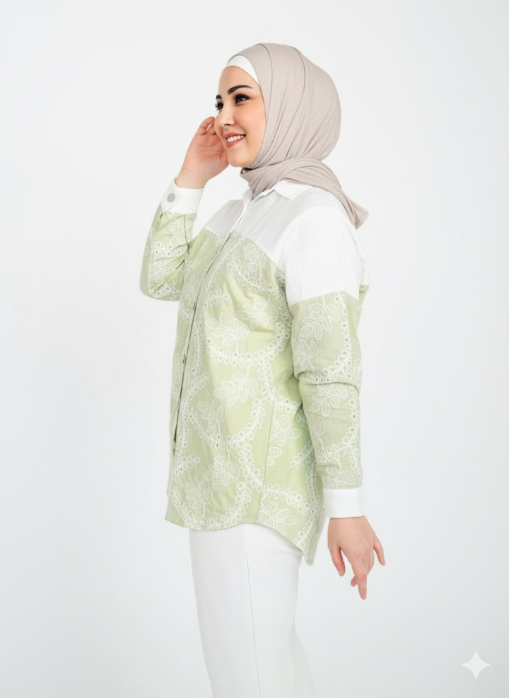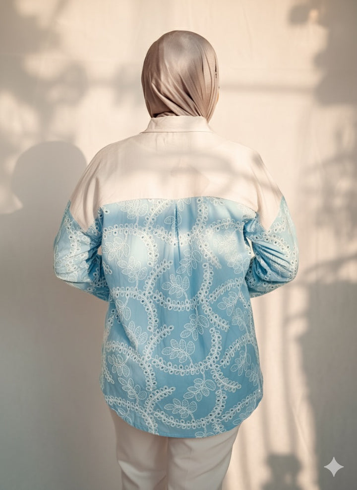 A refined button-down shirt blending crisp white with warm beige, adorned with intricate white leaf embroidery for an airy, feminine touch. The mix of solid fabric and delicate cutwork detailing creates a look that’s both elegant and effortlessly relaxed—perfect for elevating casual days or softening tailored outfits.
