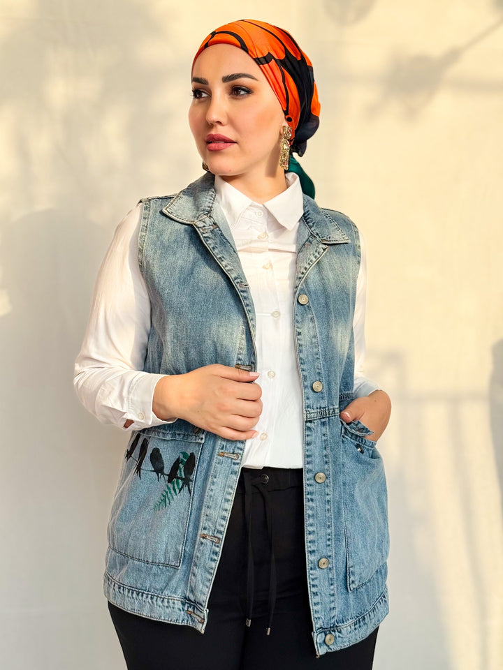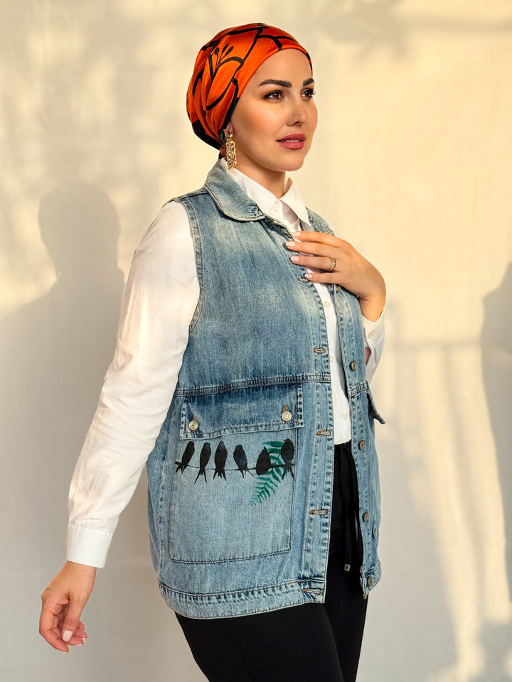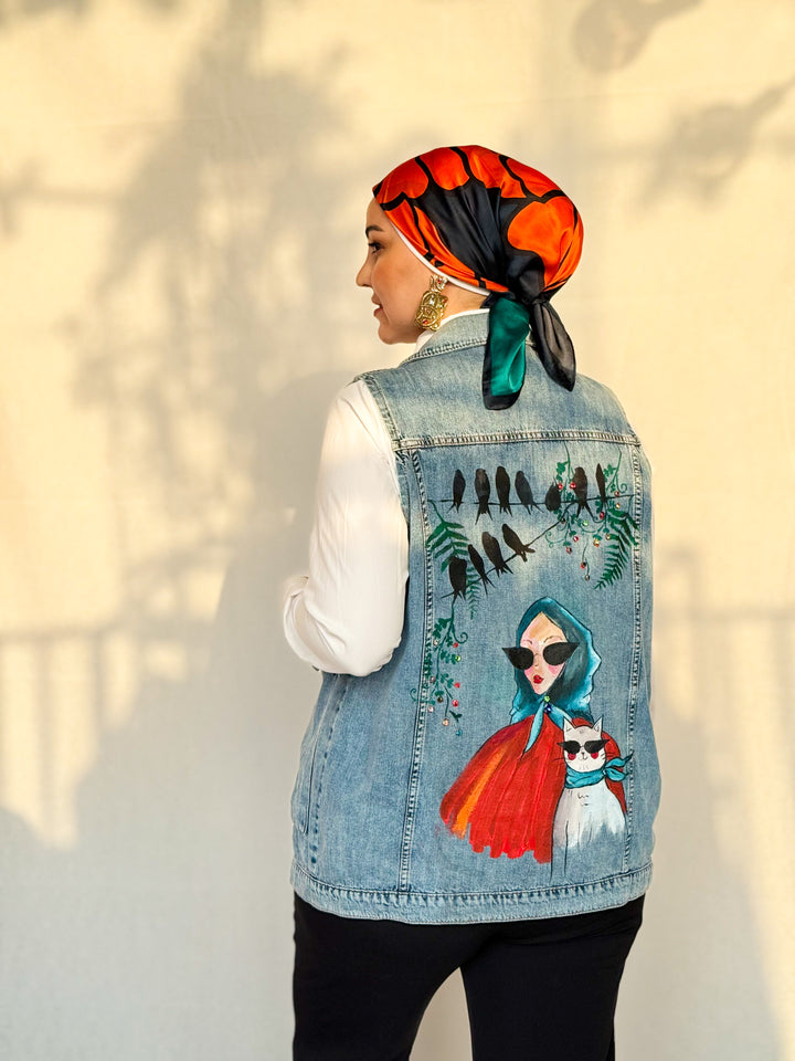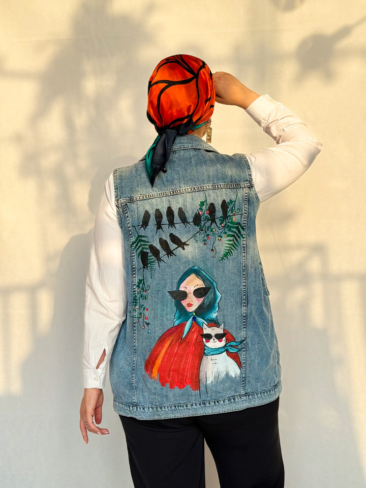 This statement denim vest is a wearable piece of art, featuring an exclusive hand-painted design that exists in only one piece worldwide. The back is adorned with a bold, artistic scene: a stylish woman in a vibrant red cape and teal headscarf, paired with her cool, sunglass-wearing cat, set beneath a row of blackbirds perched on leafy branches with delicate berry accents.