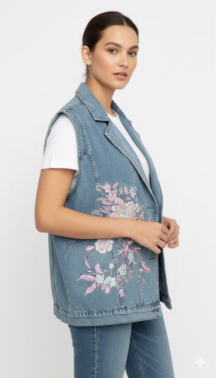 A stylish hand-embroidered denim vest featuring delicate pink floral designs stitched along the side. Crafted with care, each flower is embroidered by hand, giving the piece a unique and artistic touch. The classic denim fabric pairs perfectly with the soft pink details, creating a versatile vest that adds a feminine and elegant accent to any outfit.