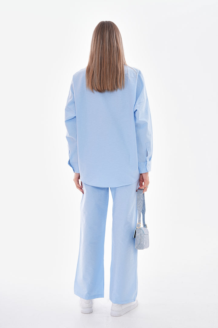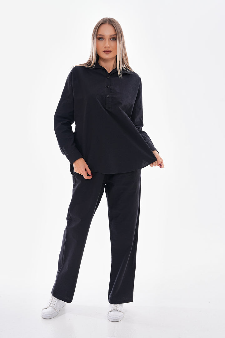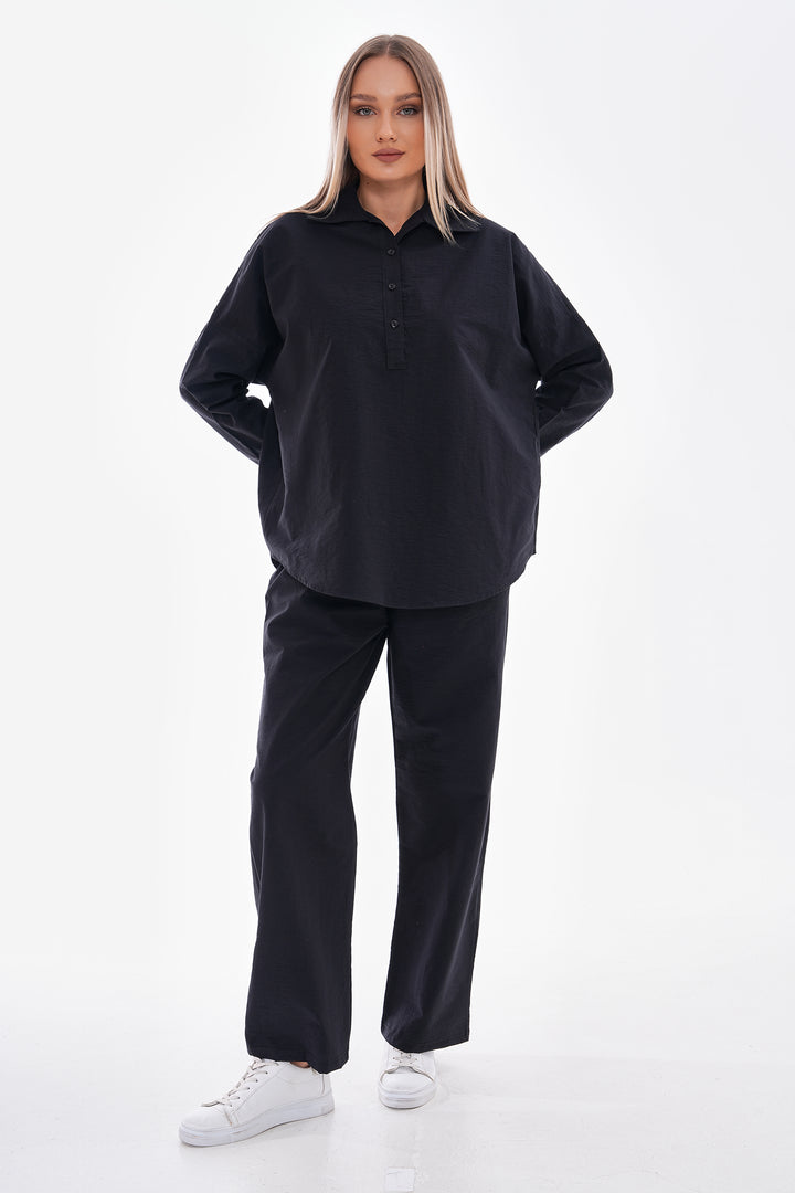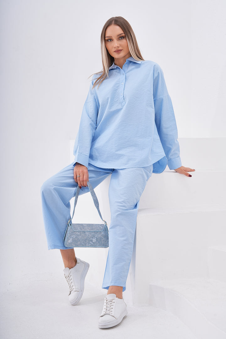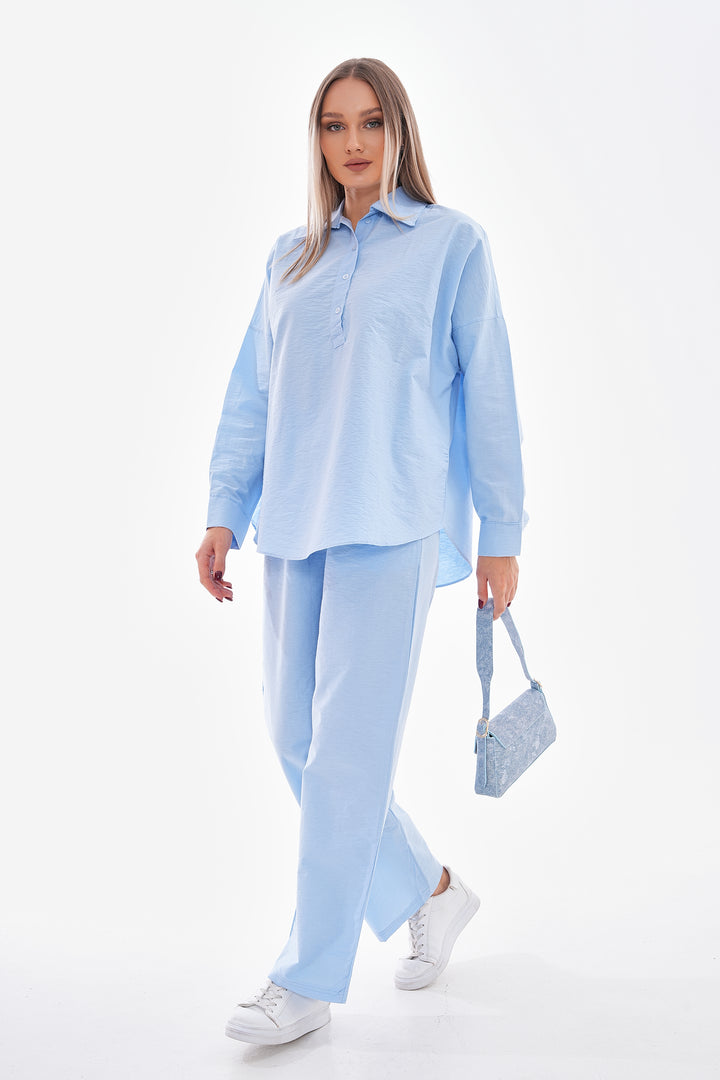 A stylish two-piece ensemble featuring a lightweight shirt with button detail and matching straight-leg pants. Designed from breathable fabric, perfect for casual days or relaxed outings, offering comfort with a chic touch.