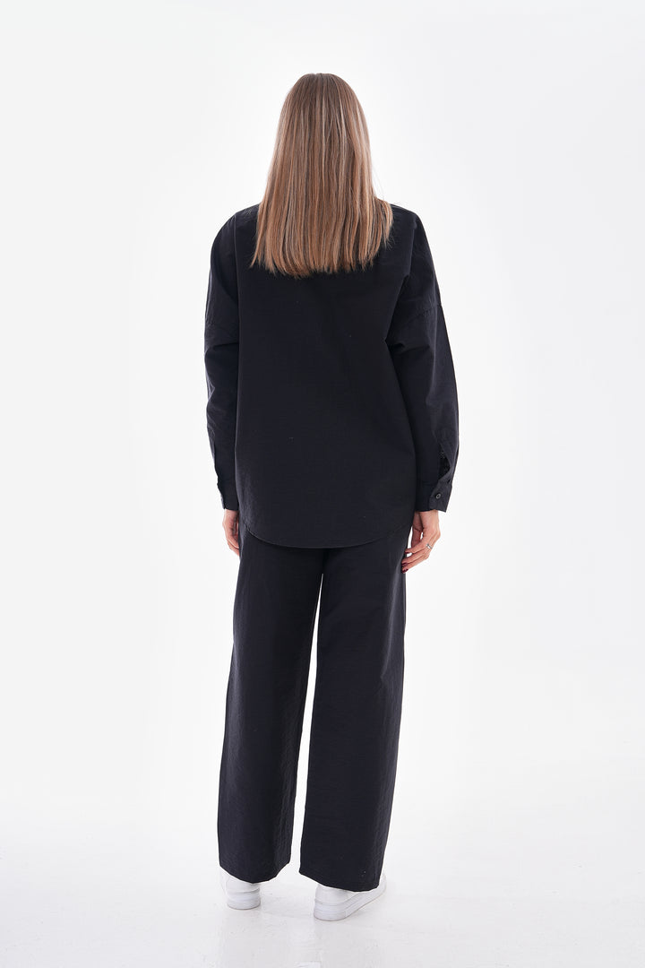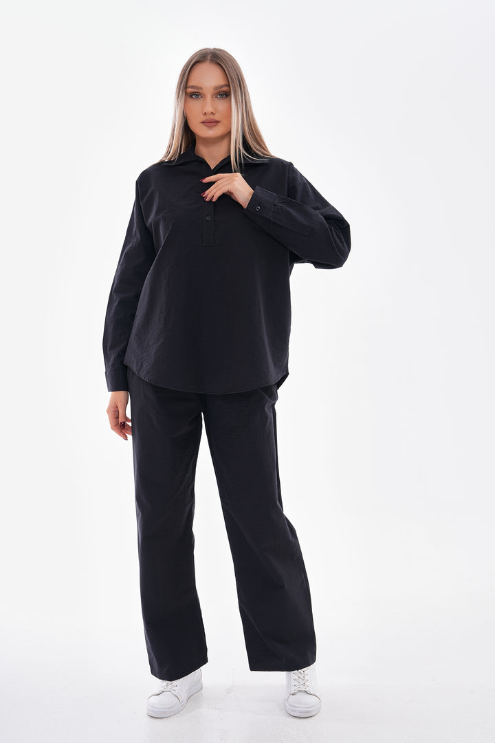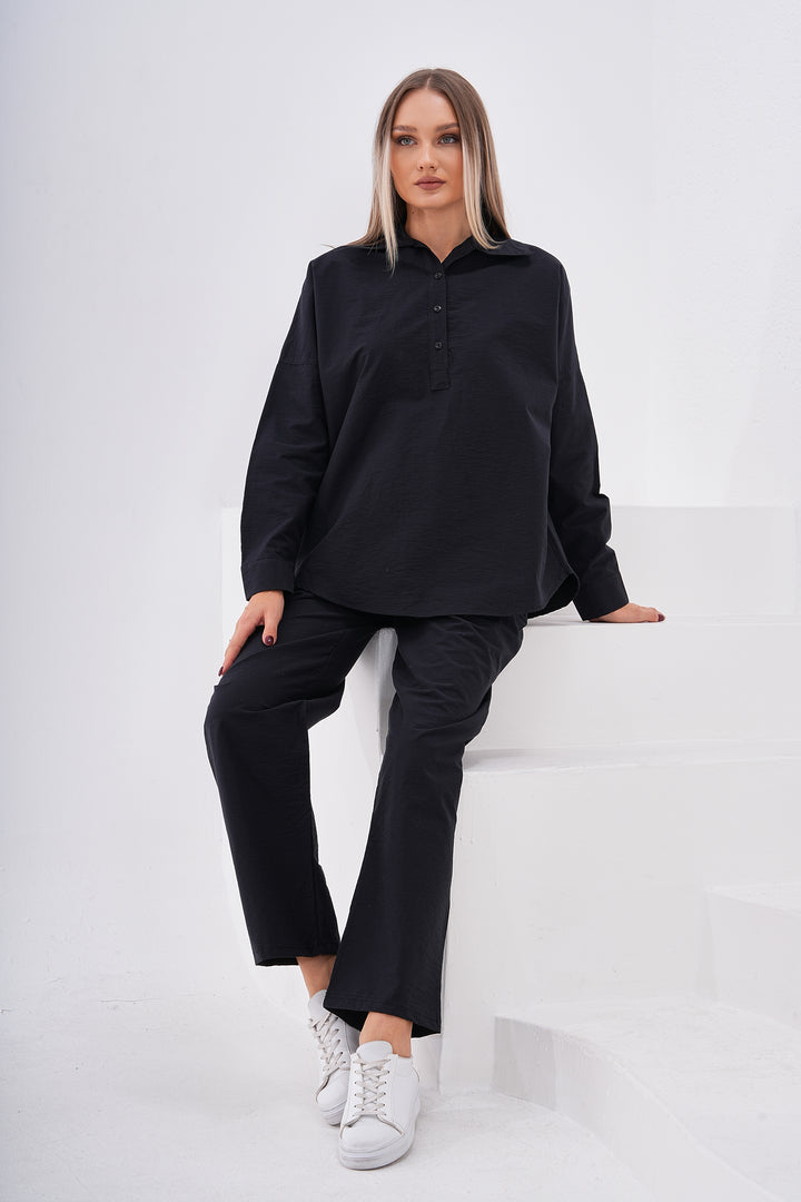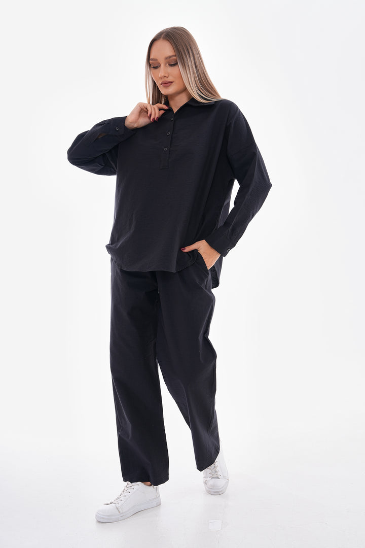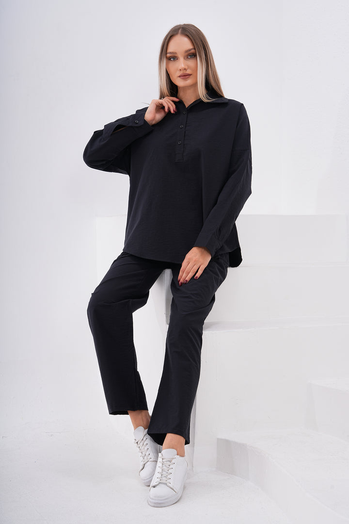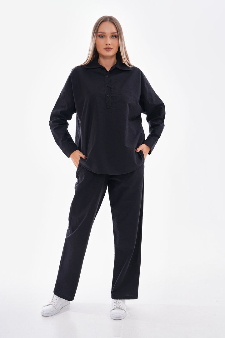 A stylish two-piece ensemble featuring a lightweight shirt with button detail and matching straight-leg pants. Designed from breathable fabric, perfect for casual days or relaxed outings, offering comfort with a chic touch.