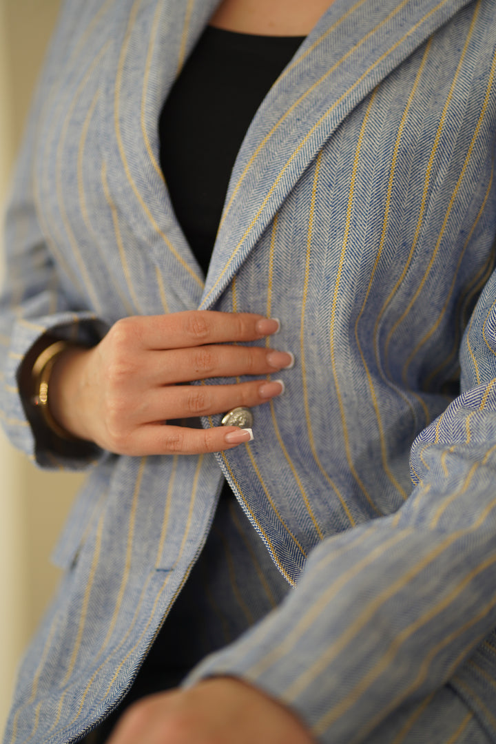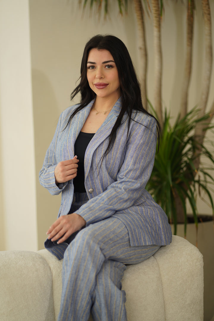 A sophisticated formal suit in blue with beige vertical stripes, featuring a tailored blazer with front buttons and practical pockets, paired with matching trousers. This design combines timeless elegance with a modern twist, making it perfect for both business and special occasions.