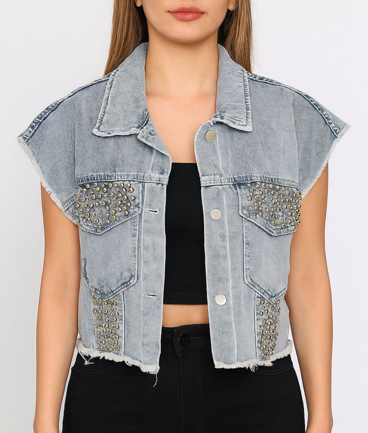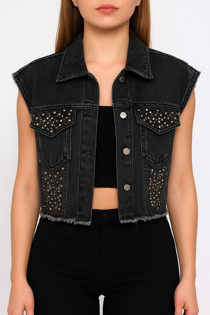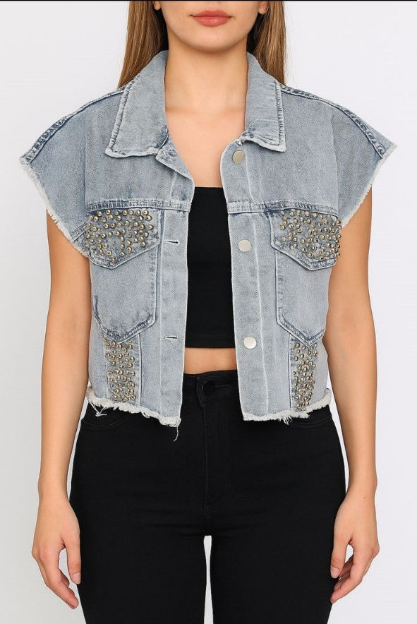 silver pin style short denim jacket designed with raw-edge sleeves and a modern cropped fit. The vest features statement metallic studs on the front pockets and hem, adding just the right amount of edge and style. Perfect for layering over casual outfits, this piece combines comfort with a bold, chic vibe.